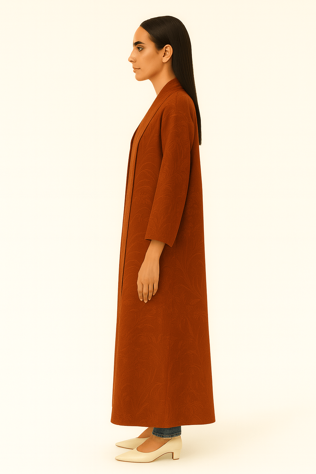 Description: A modern abaya in a warm rust tone with subtle texture for understated elegance. Highlights: Cotton blend with breathable comfort and structured drape Tonal woven pattern for quiet sophistication Open-front silhouette for easy layering Lightweight and versatile for day-to-evening wear Neutral tone pairs seamlessly with wardrobe staples…