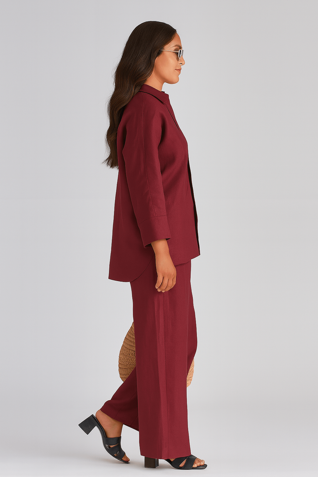 Description: Elevate your everyday style with this effortlessly chic coord set, crafted from our breathable Crepe Mix fabric. The relaxed silhouette features a longline shirt with a concealed button placket and wide-leg trousers with an elasticated waist for all-day comfort.