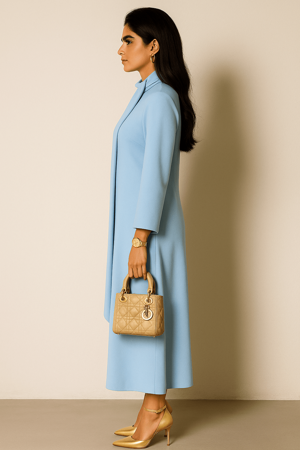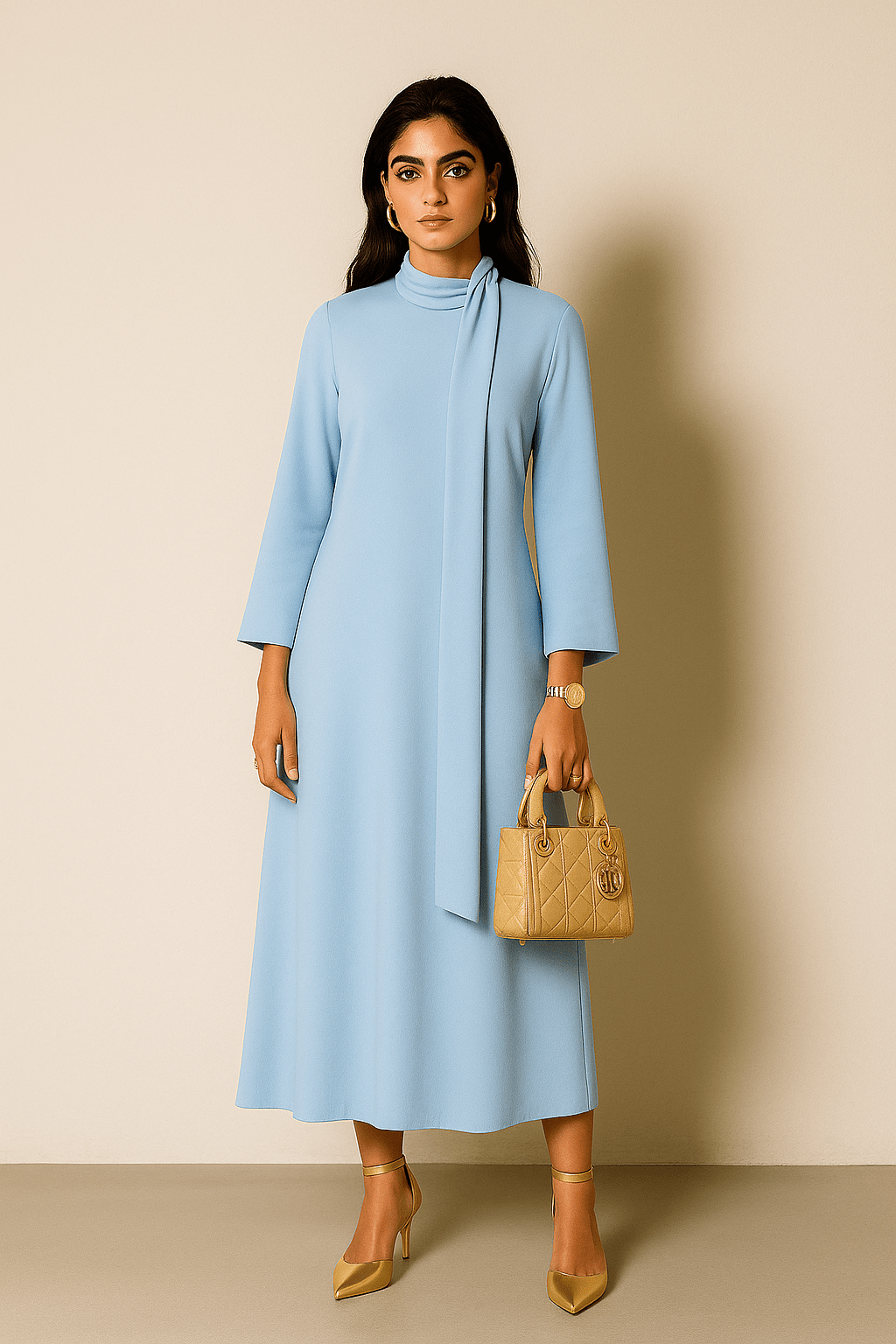 Description: A crepe dress designed for versatile, modern styling. Highlights: Crafted with crepe Midi length Versatile styling for everyday and occasion wear Pairs easily with your existing wardrobe Description: Fabric: Crepe Indonesia Elegant meets effortless in our Aisha’s dress, crafted in a serene baby blue shade that speaks summer sophistication.