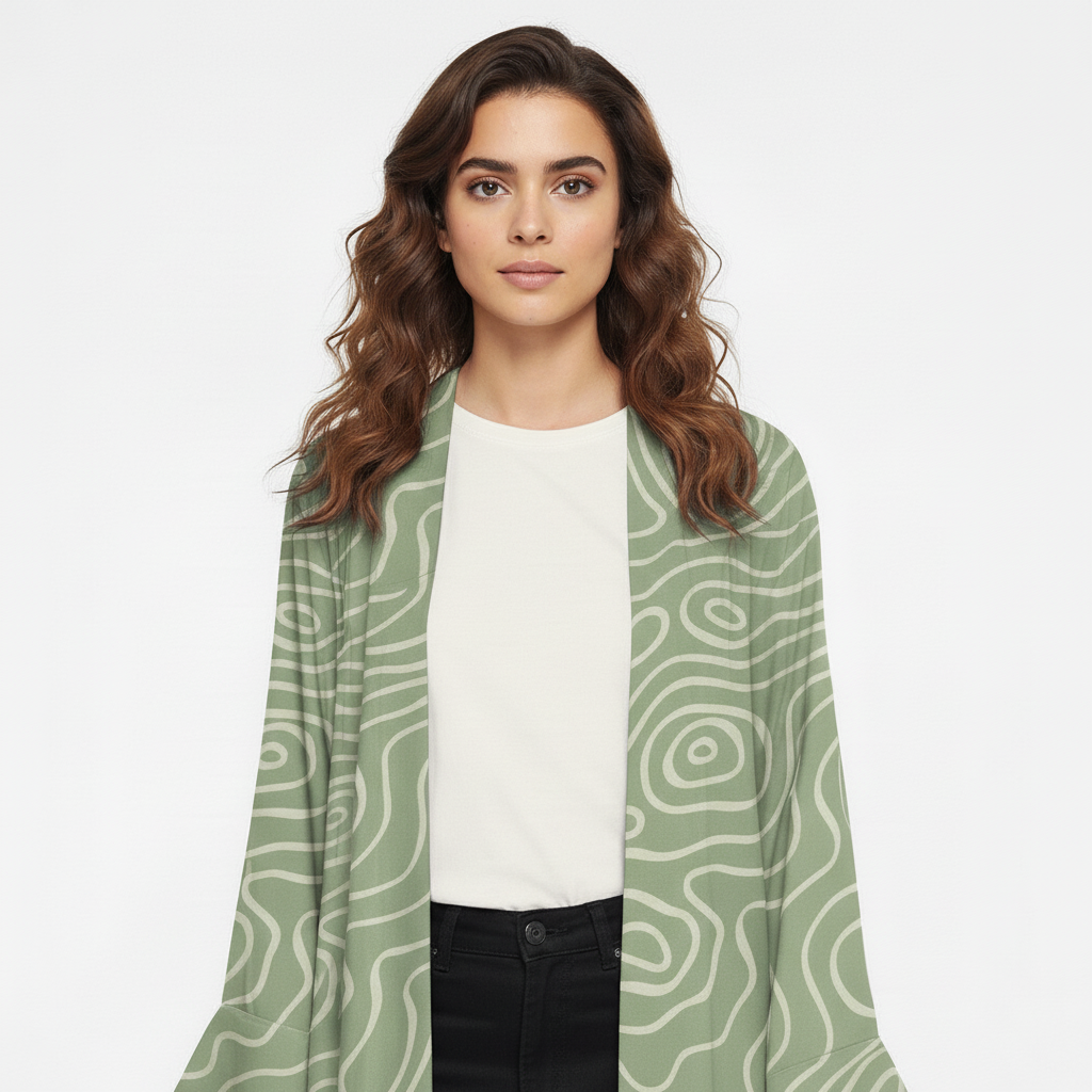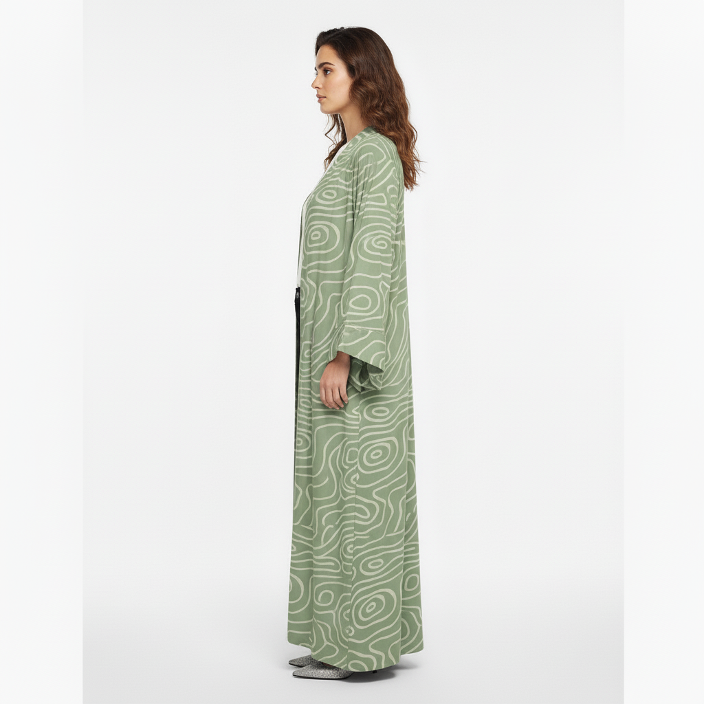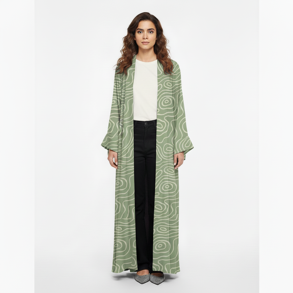 This sage green abaya in luxurious mang silk showcases a soft sheen and fluid silhouette. The abstract print lends a modern, artistic touch, while the open-front design offers easy layering over both casual and dressy looks. Its lightweight texture makes it perfect for transitional seasons, balancing sophistication with everyday ease.