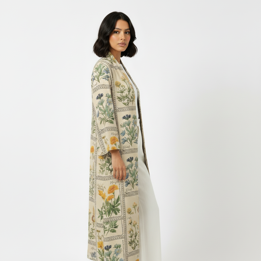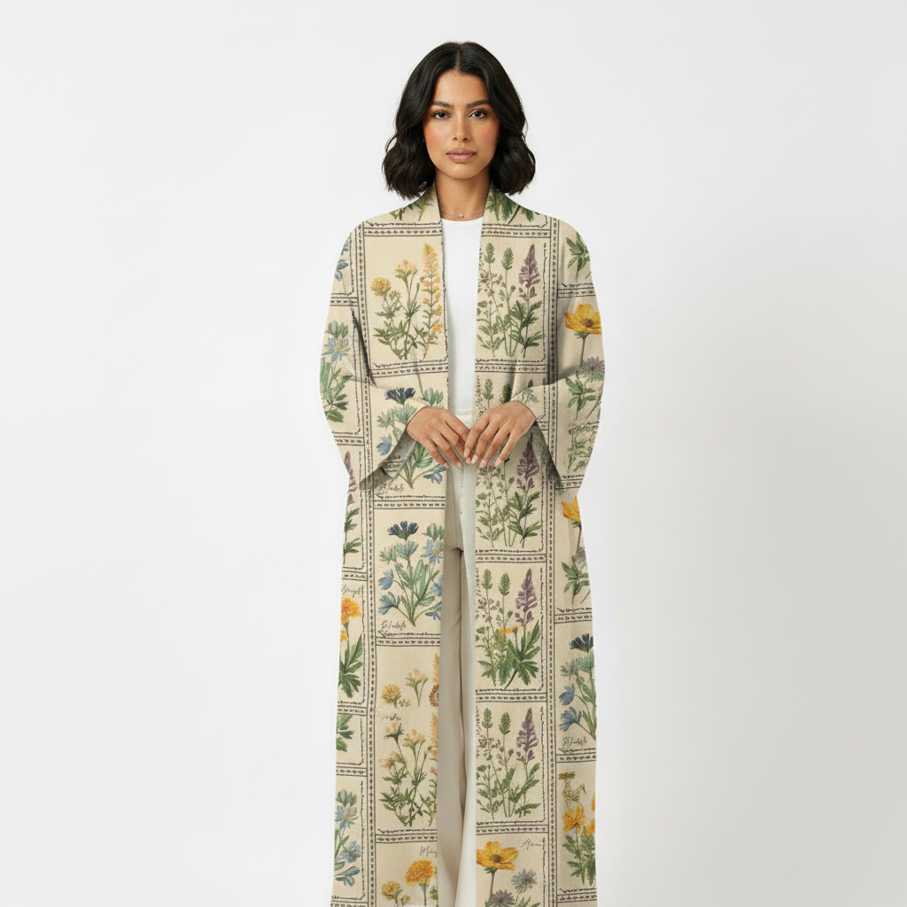 Crafted from smooth mang silk, this abaya features an intricate botanical print that brings effortless elegance to any look. The open-front design makes it easy to layer over simple ensembles, while the silk’s natural flow enhances movement and grace. Perfect for daytime gatherings or refined evening moments, it’s a modern ode to timeless style.