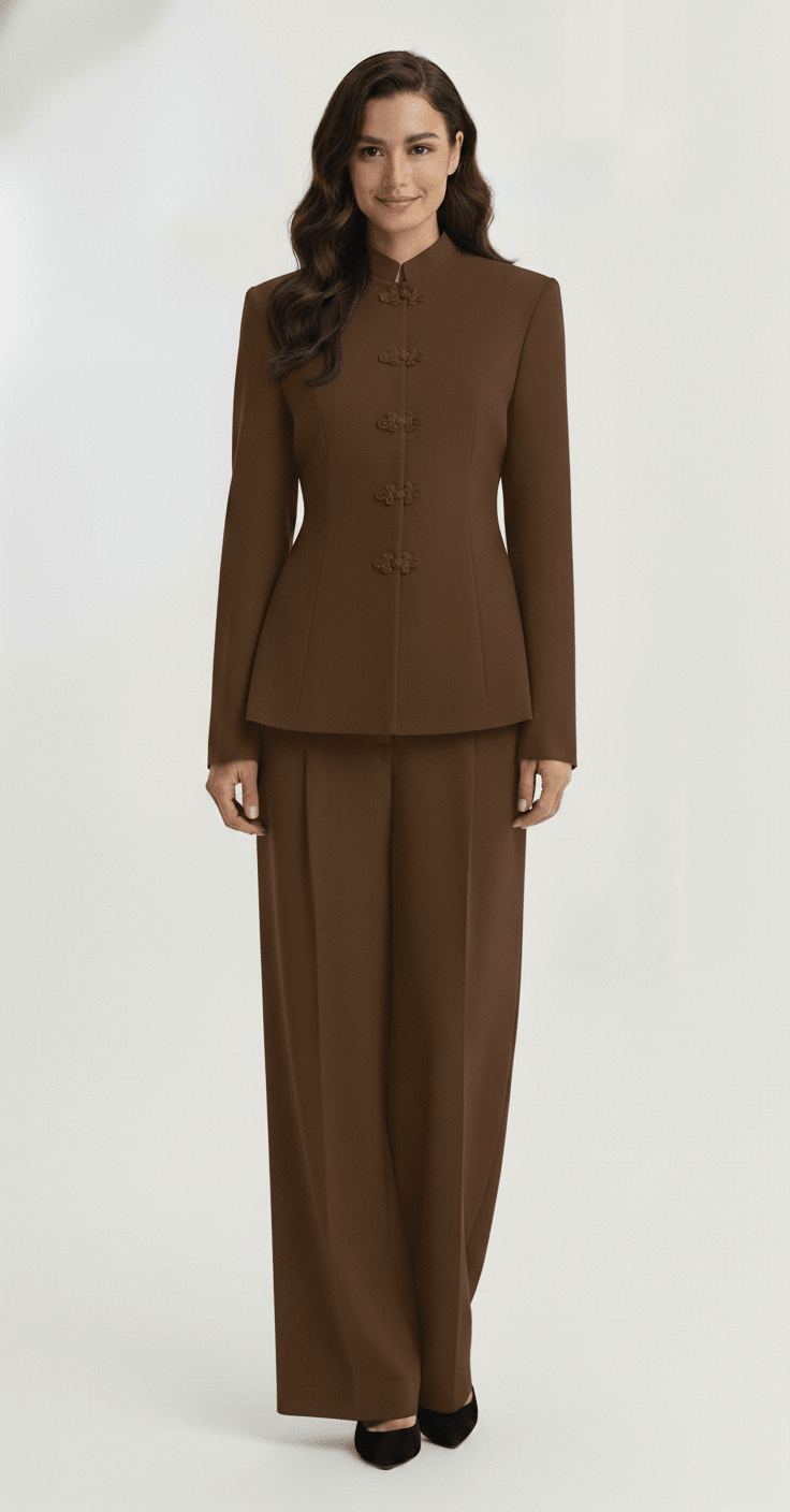 This mandarin-collar blazer and pants set embodies timeless elegance through precise tailoring and thoughtful detailing. The structured blazer features handcrafted knot buttons that add a subtle artisanal touch while maintaining a clean, minimal aesthetic. Designed to contour gently at the waist, it creates a refined silhouette without compromising comfort. Paired with wide-leg trousers that fall effortlessly from the waist, the set delivers balance, poise, and contemporary modest appeal. A versatile ensemble crafted for women who appreciate strong structure softened with understated detail.