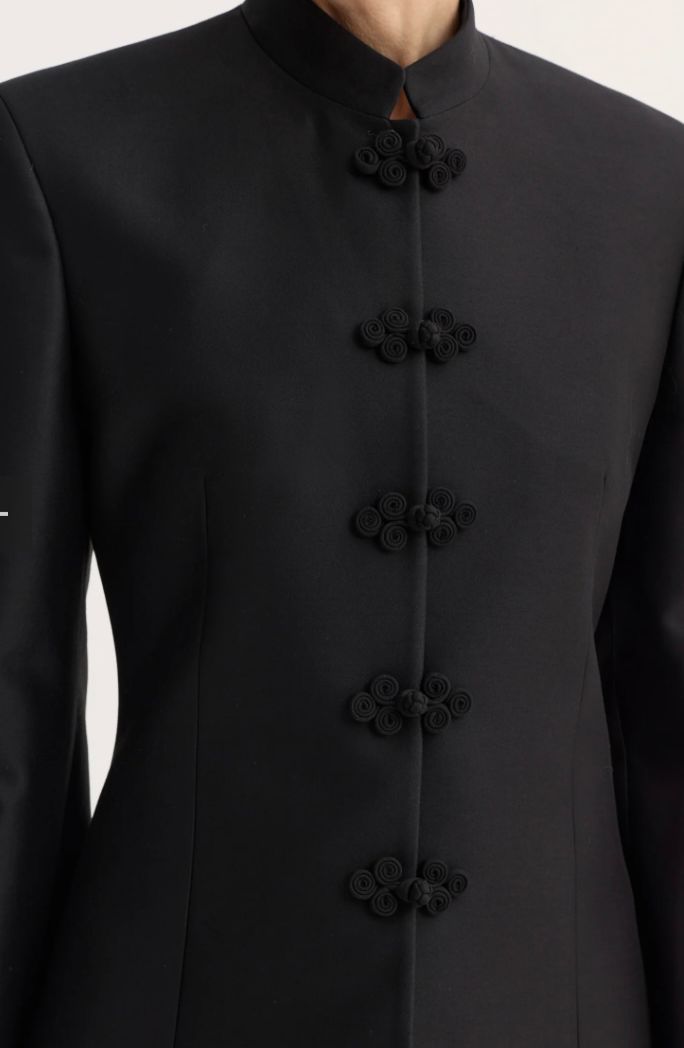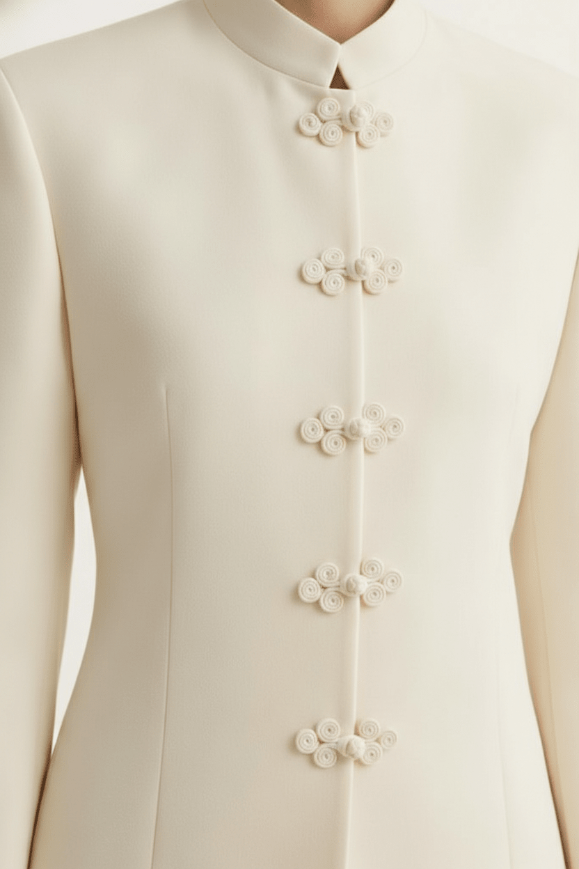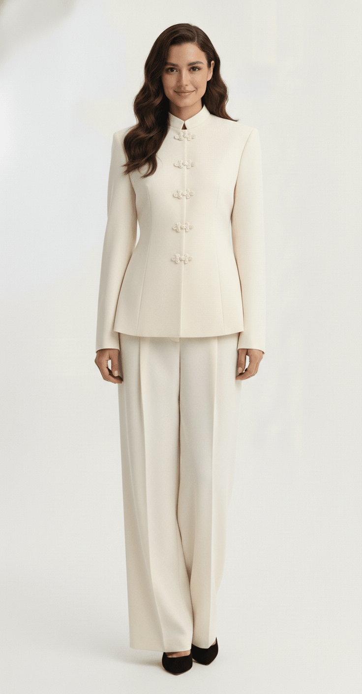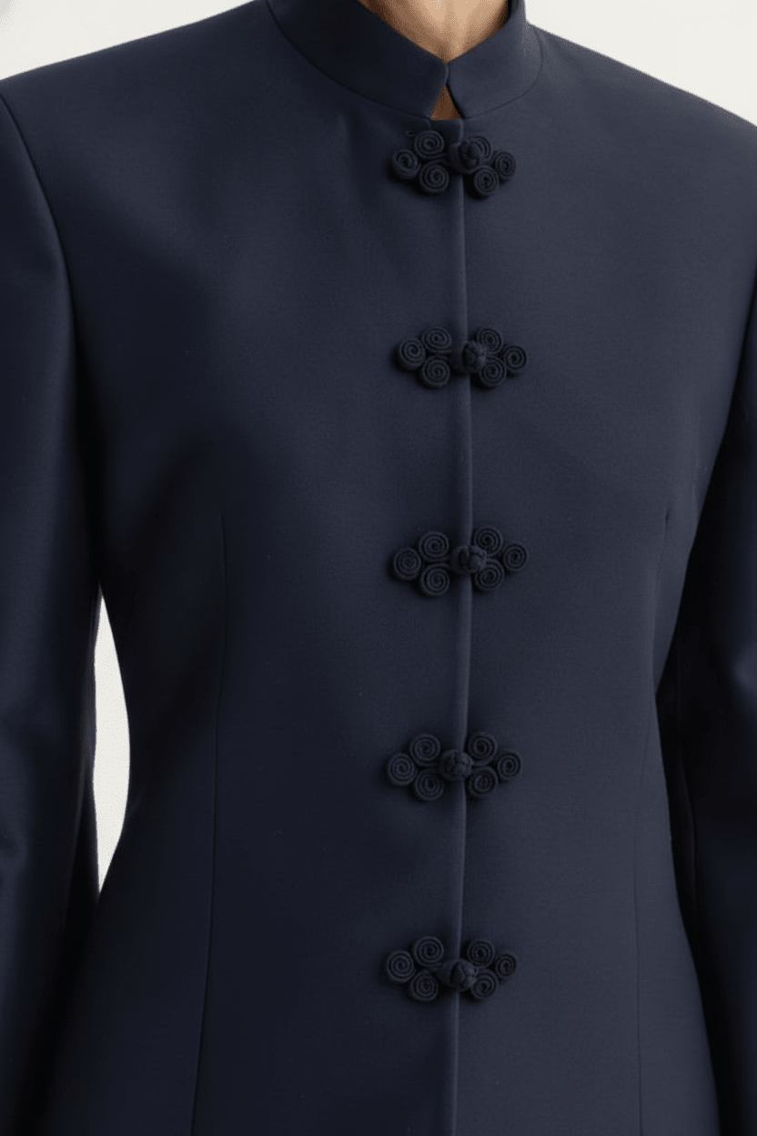 A tailored mandarin-collar blazer set elevated with handcrafted knot-button detailing, designed for refined structure and effortless sophistication.
