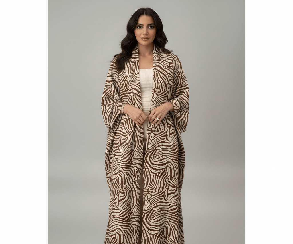 This zebra-print kimono redefines casual chic with its soft cotton mix and fluid drape. The earthy brown tones lend warmth, while the open-front cut makes layering simple and stylish. Perfect for transitional days, it adds instant personality to both relaxed and refined outfits.