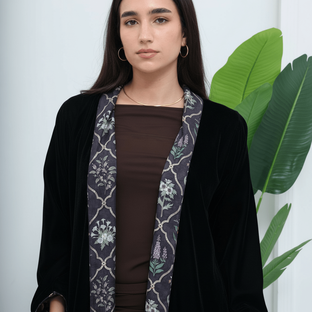 Designed with a sleek velvet front, this abaya brings understated luxury to everyday dressing. The printed inseam reveals itself as you move, adding depth and visual interest without overpowering the look. Cut in a relaxed open-front silhouette, it layers seamlessly over dresses or separates for polished, modern modest wear.
