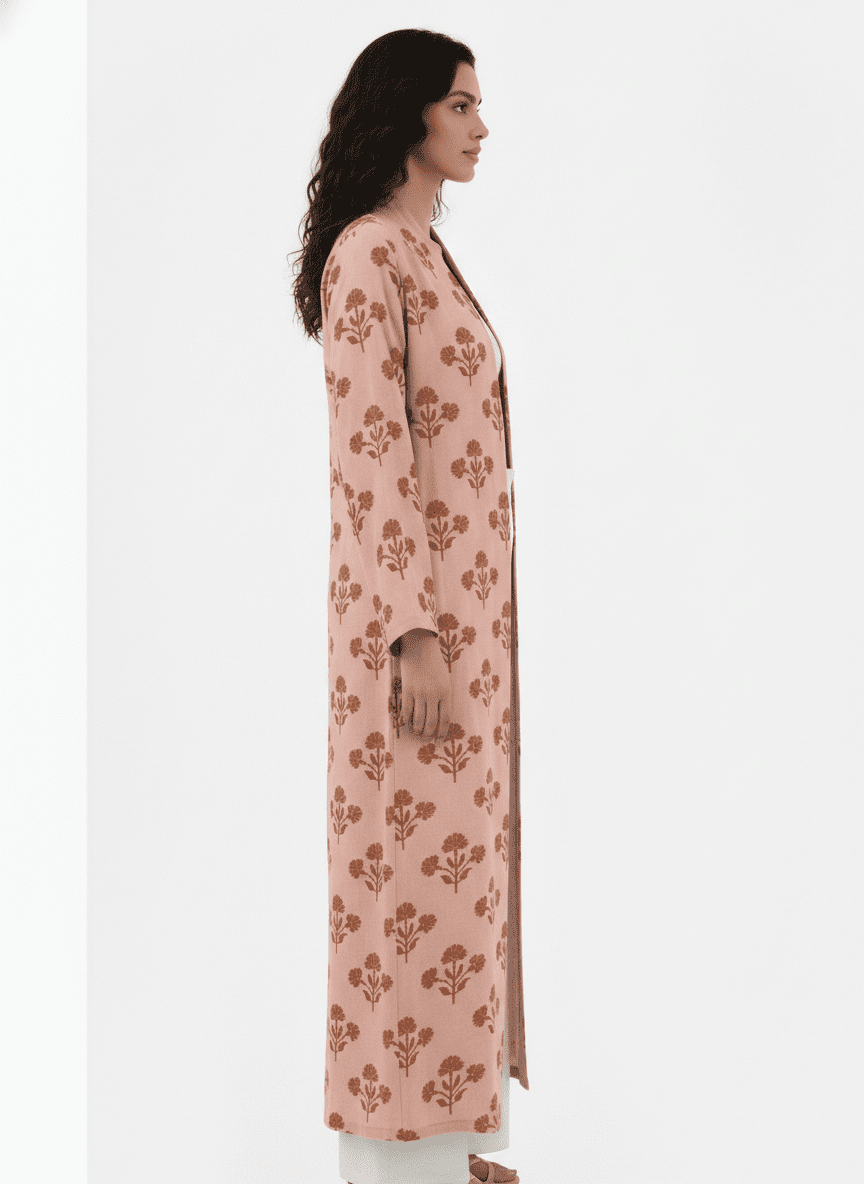 Crafted from a soft crepe mix, this blush pink kimono abaya falls effortlessly with a natural, matte finish. The open-front cut creates a clean, elongated line, while the repeated floral motif adds subtle character without overpowering the look. Designed as a versatile layering piece, it pairs seamlessly with neutral sets for a calm, polished finish.