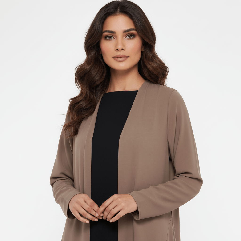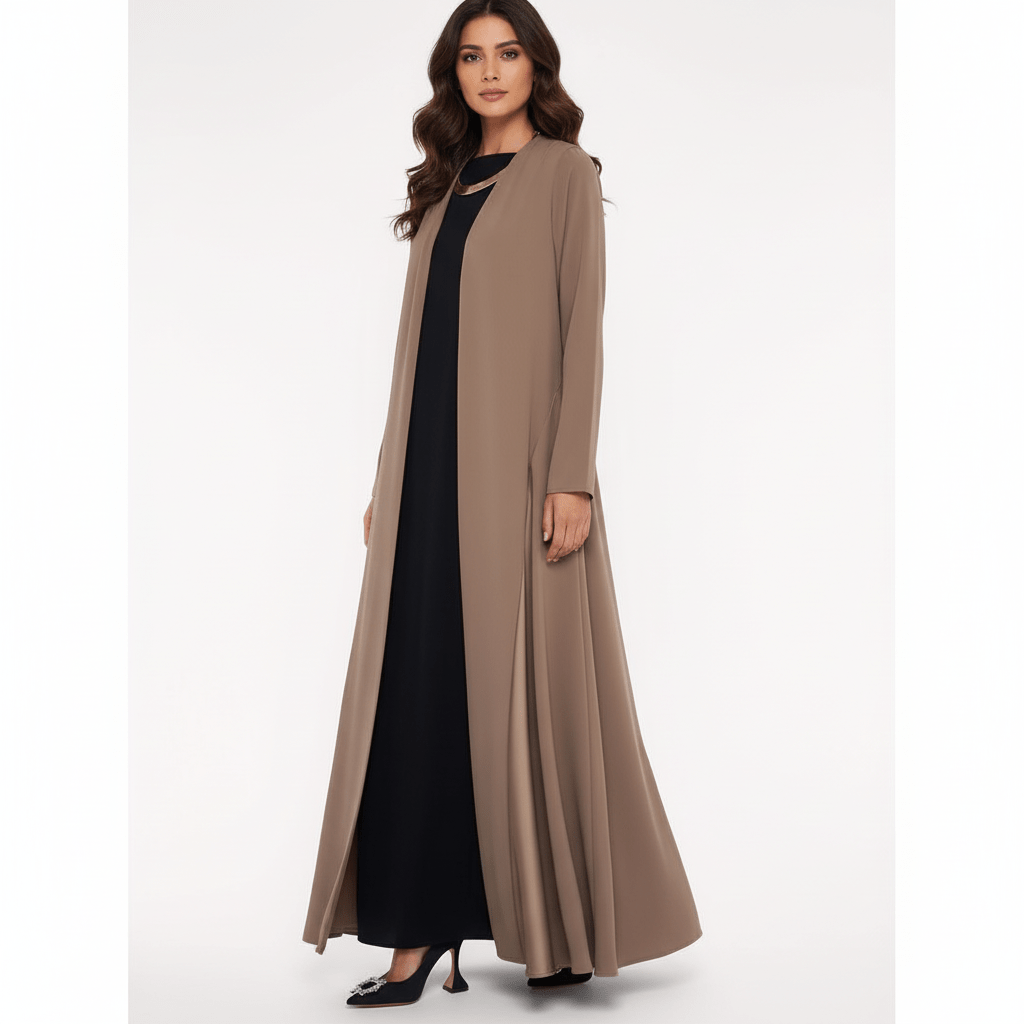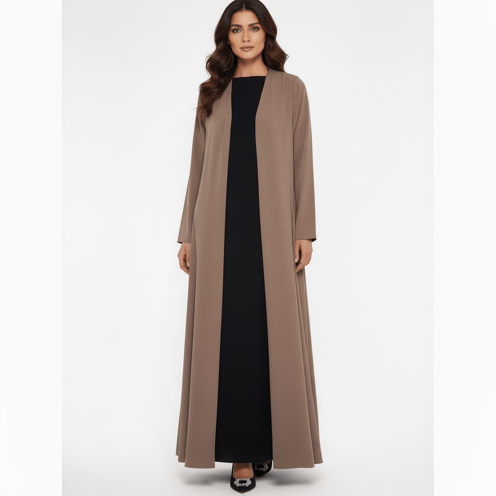 This mocha abaya fuses textures for a refined statement. The silk crepe front offers a graceful matte finish, while satin side panels create a luminous flow with every step. Designed in an open, full-length cut, it’s an effortlessly sophisticated layer for both formal events and elevated everyday wear.