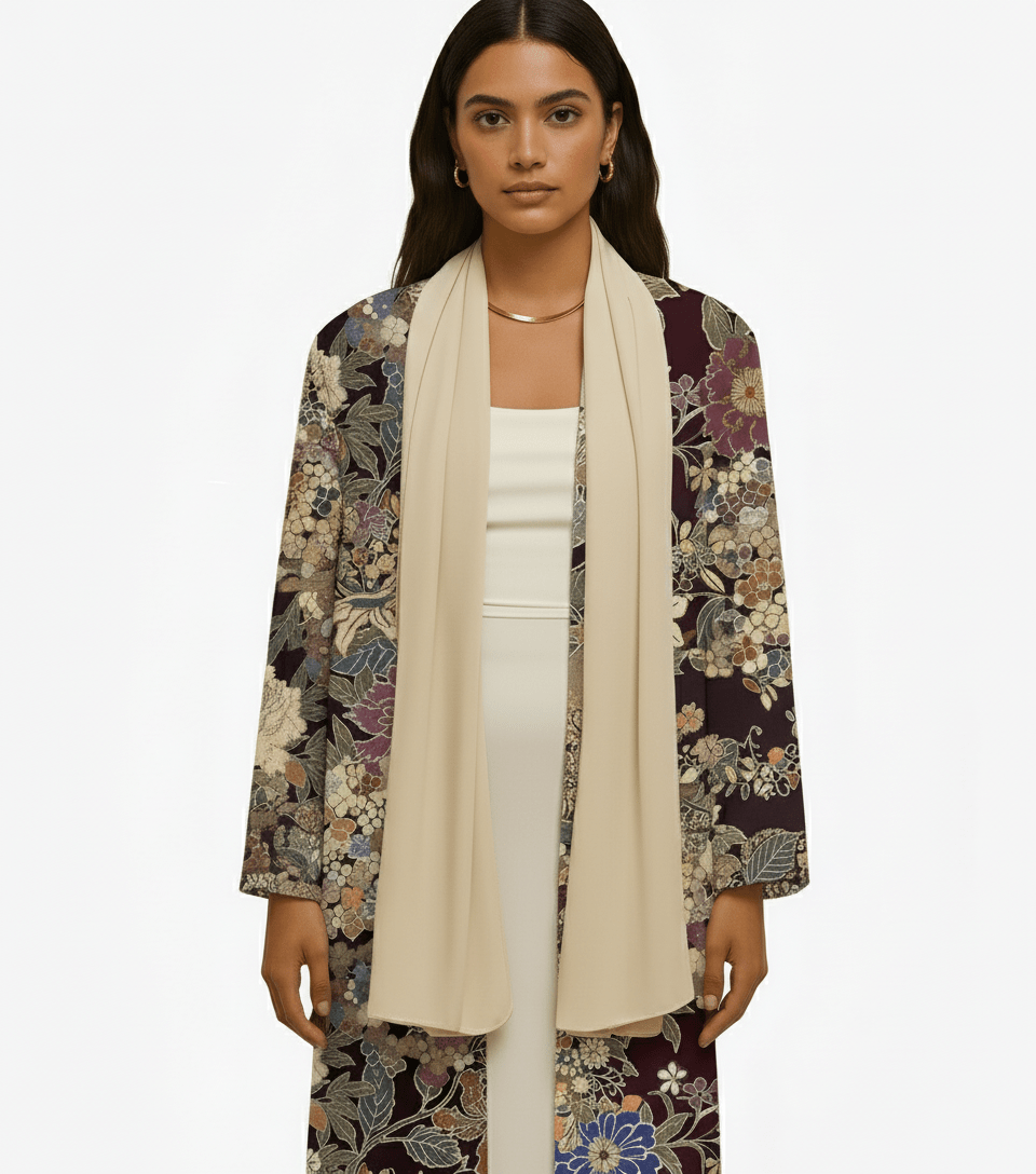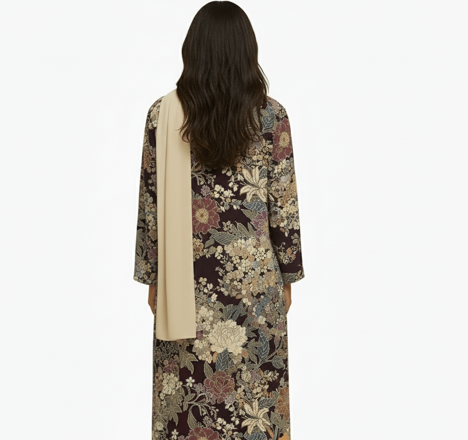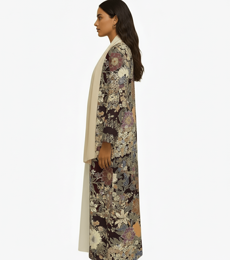 Crafted from lustrous mang silk, this abaya features a deep burgundy base adorned with intricate floral patterns in muted tones. The fluid silk drape enhances its elegant silhouette, while the open-front design allows effortless layering over day or evening looks. Both polished and practical, it’s a wardrobe piece that transitions seamlessly across occasions.