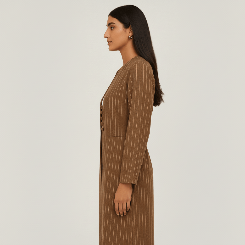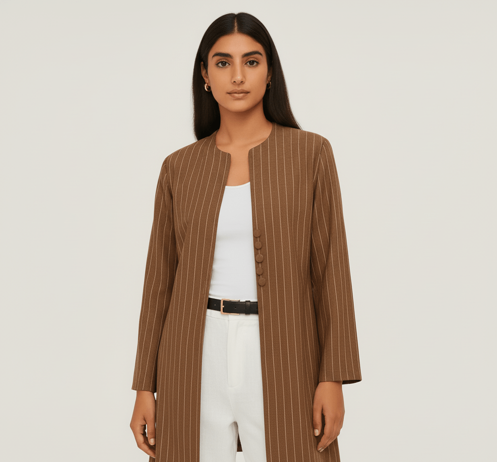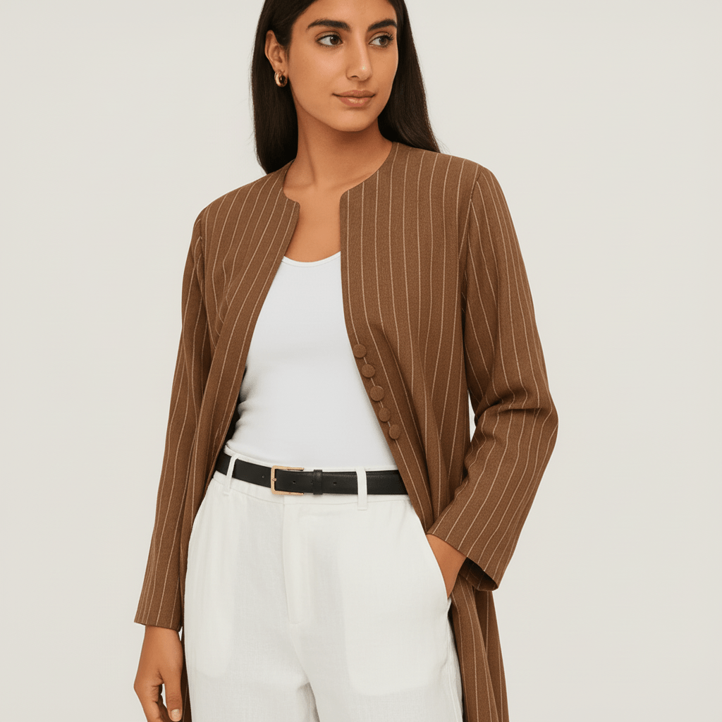 This brown long jacket is crafted from a linen-cotton blend that balances structure with breathability. Its vertical pinstripes and clean, collarless neckline create a refined, elongating effect. Designed with a slim fit through the shoulders and a relaxed drape below, it layers easily over tops, dresses, or tailored separates for a polished finish.