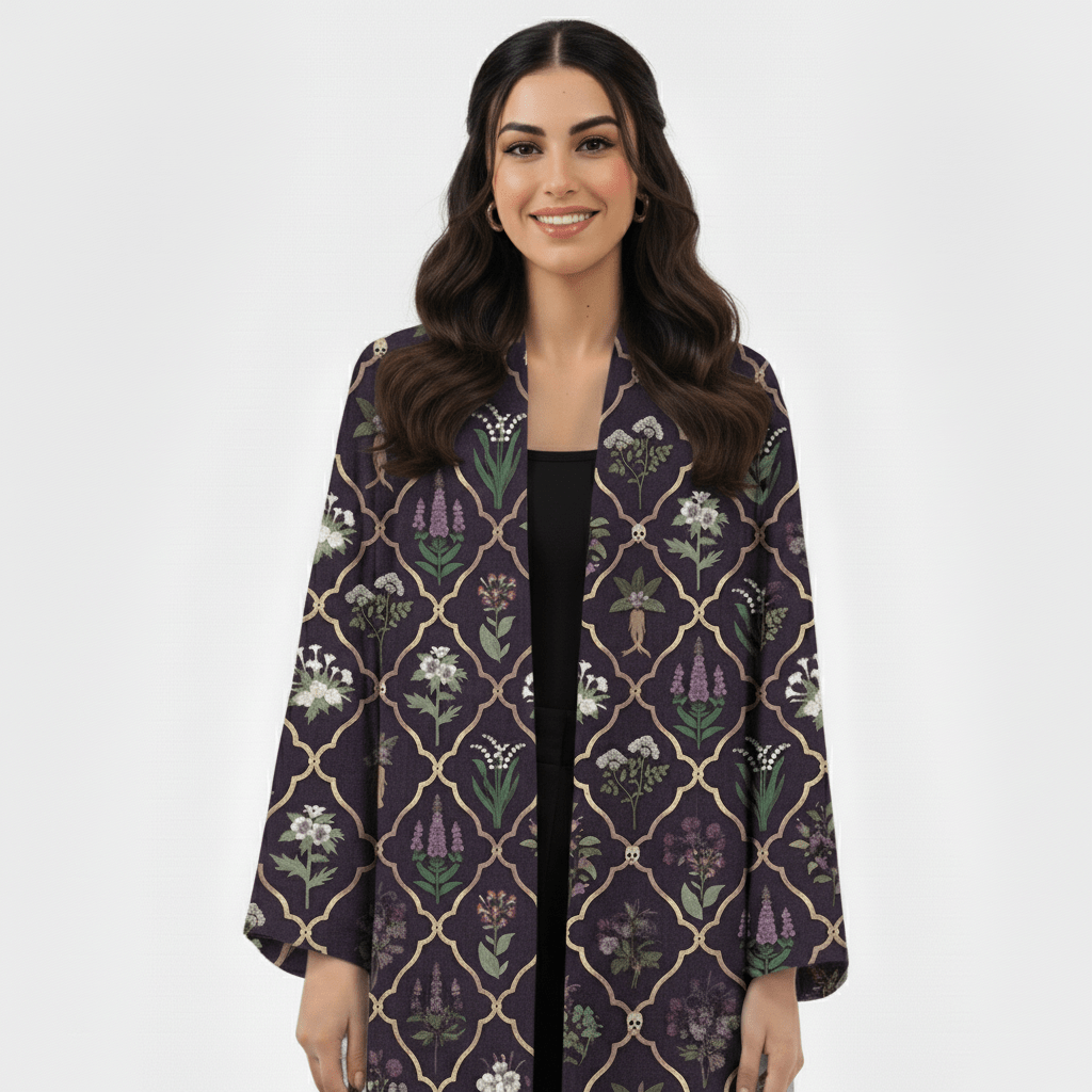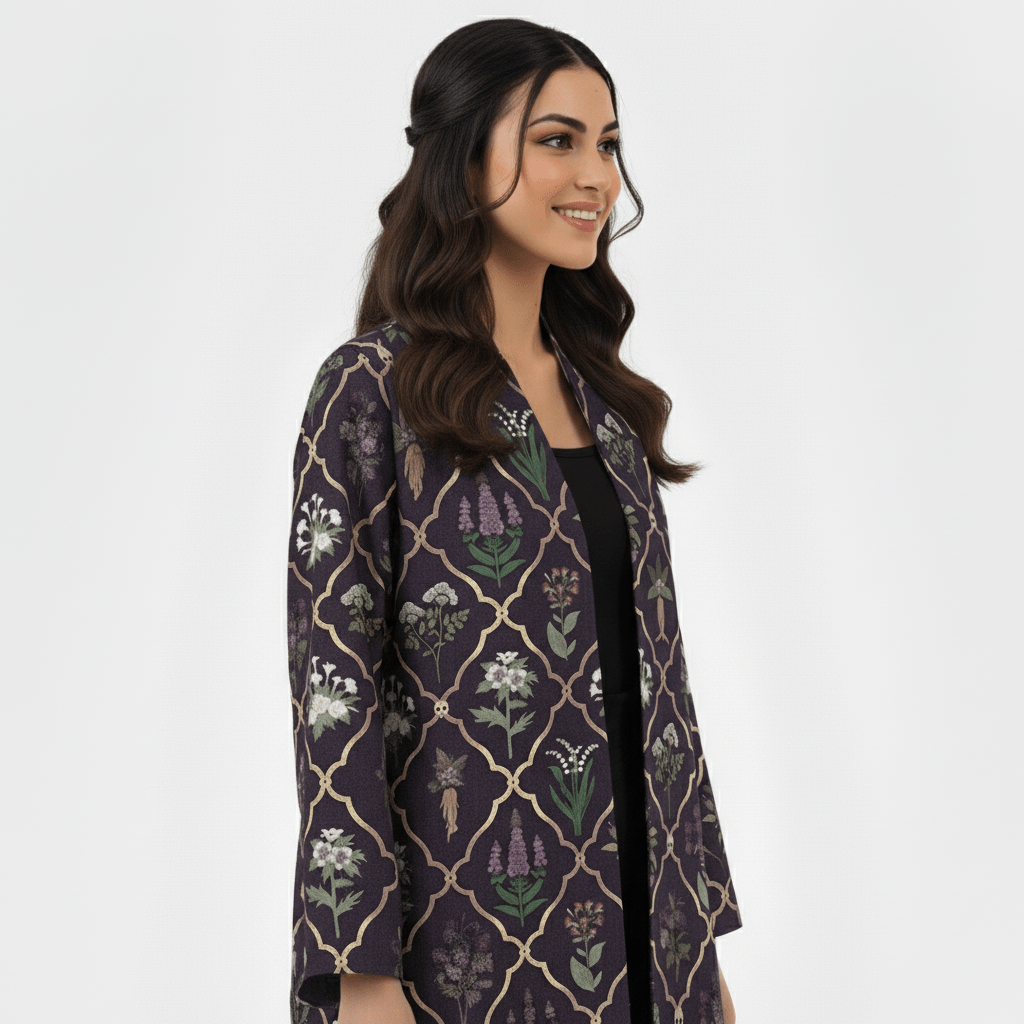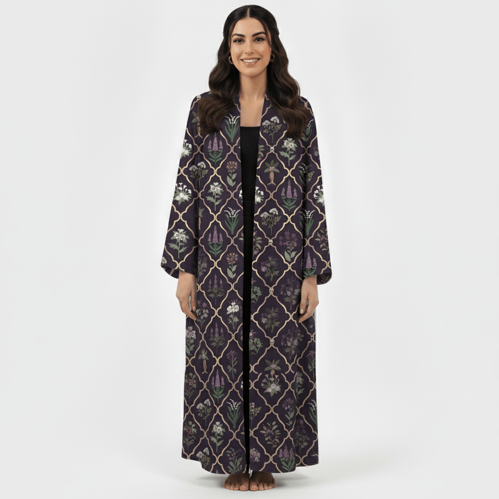 This deep plum abaya is crafted from soft, breathable linen and adorned with a geometric floral pattern that blends traditional artistry with modern elegance. The open-front design drapes beautifully, offering relaxed movement and easy layering. Ideal for elevating daytime looks or refined evening outings.