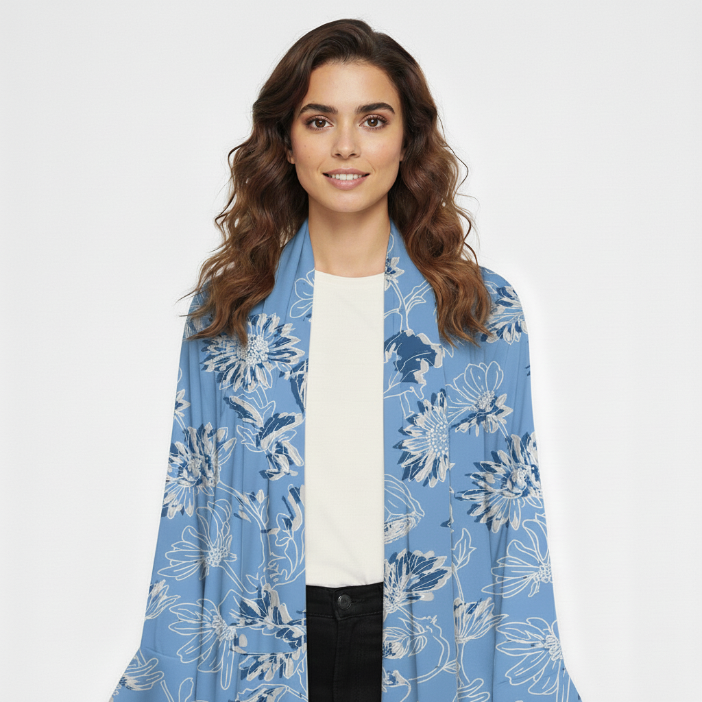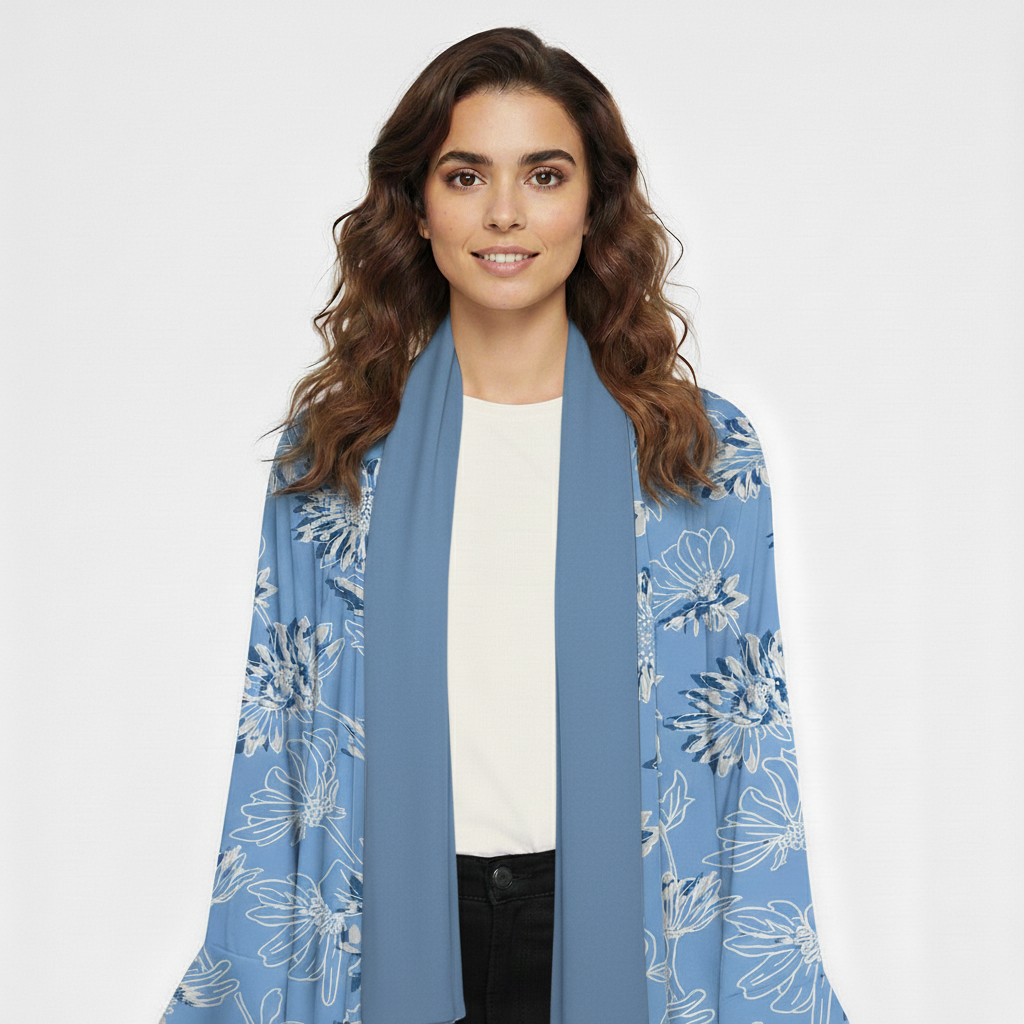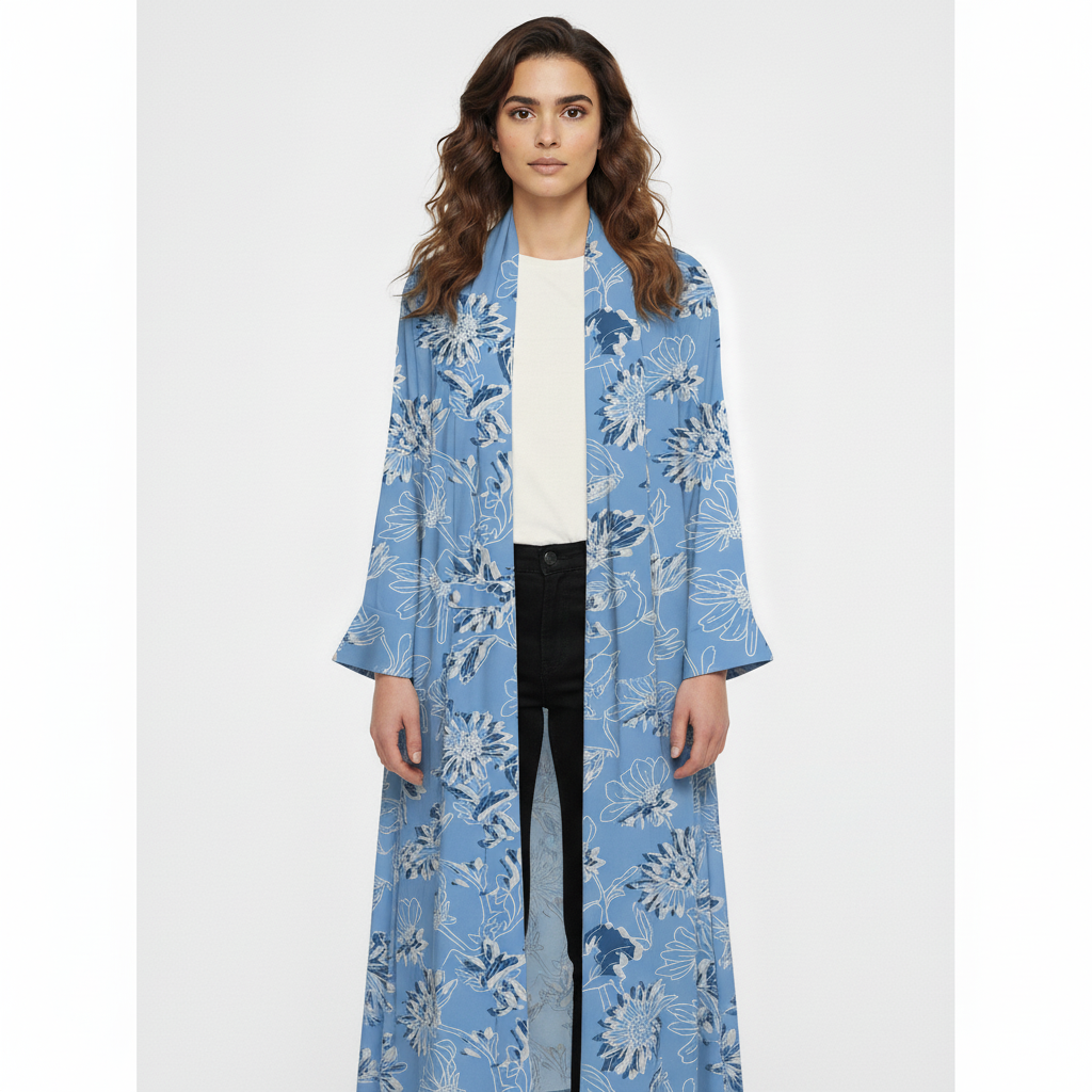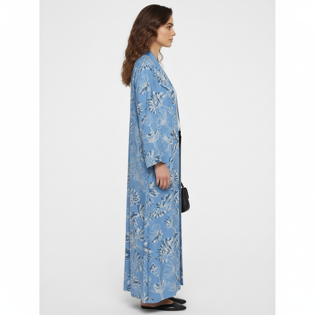 This sky blue abaya is crafted from luxurious mang silk, known for its fluid drape and subtle lustre. The floral print adds a touch of femininity, while the open-front cut ensures versatile styling over everyday or evening outfits. Breezy yet polished, it’s an effortless expression of modern modest style.