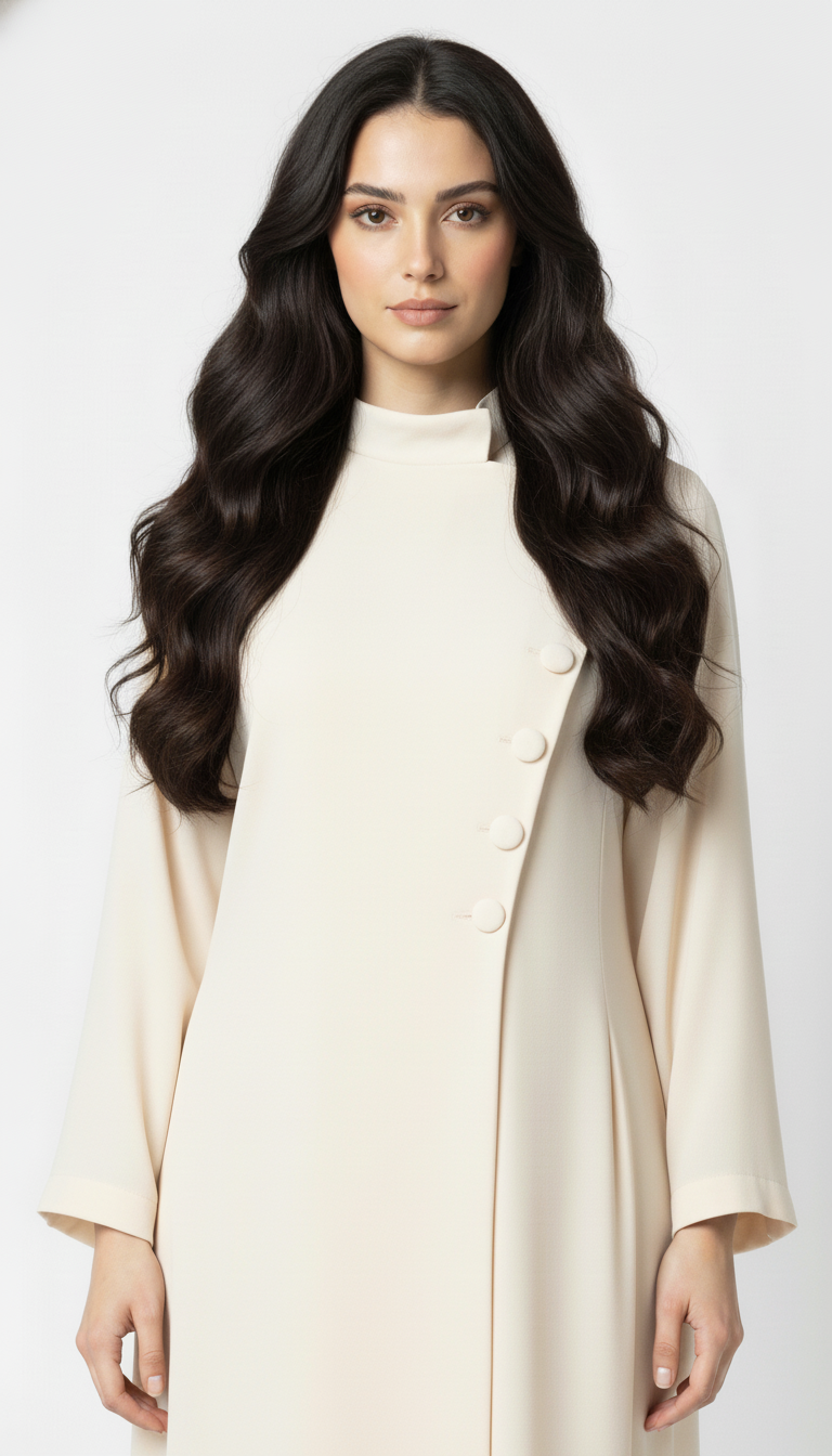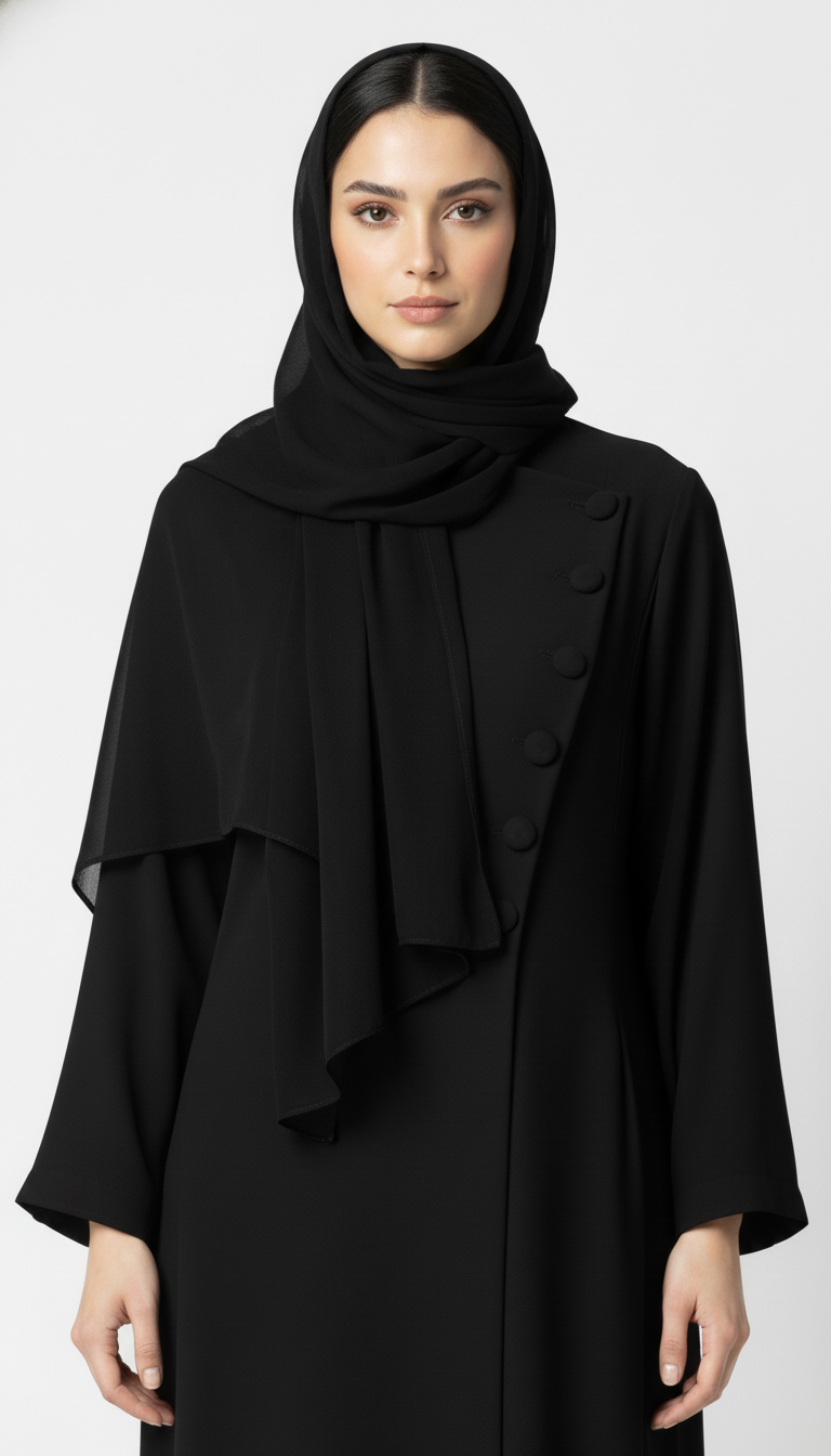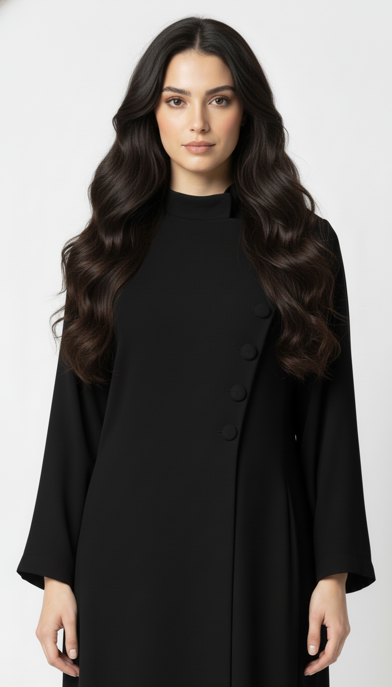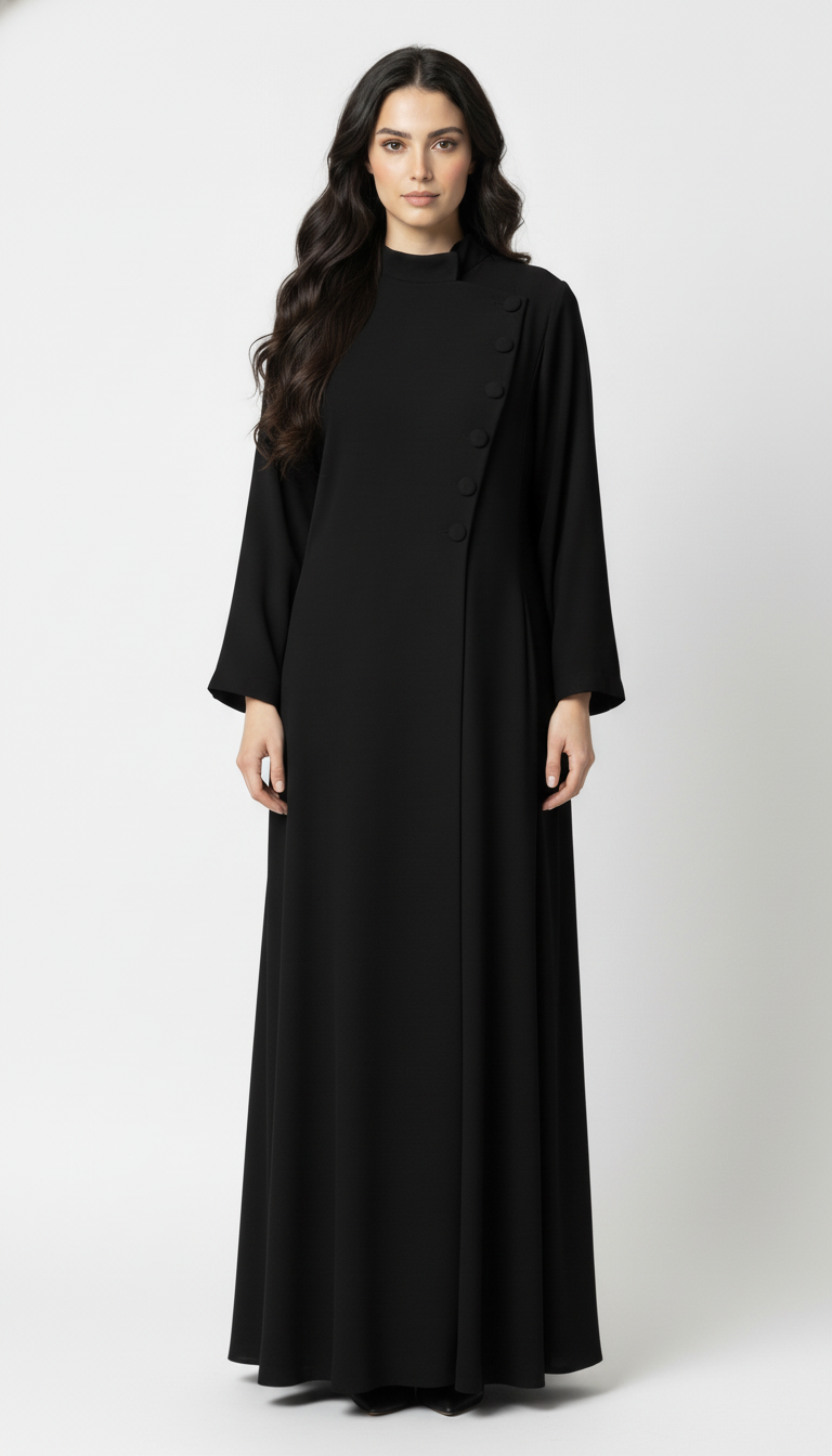 A refined mandarin-collar abaya designed with sculptural lines and modern elegance.