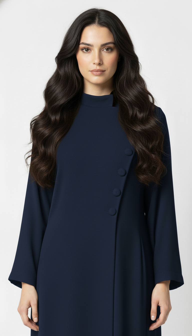 Modern structure meets timeless modest elegance in this beautifully tailored mandarin-collar abaya. Designed with a sleek high neckline, the mandarin collar frames the face with refined simplicity while creating a polished, contemporary look.