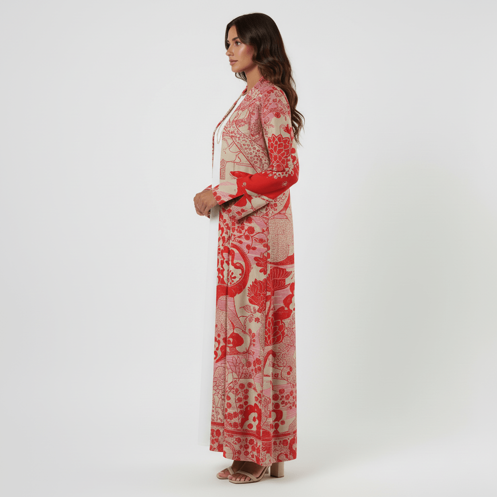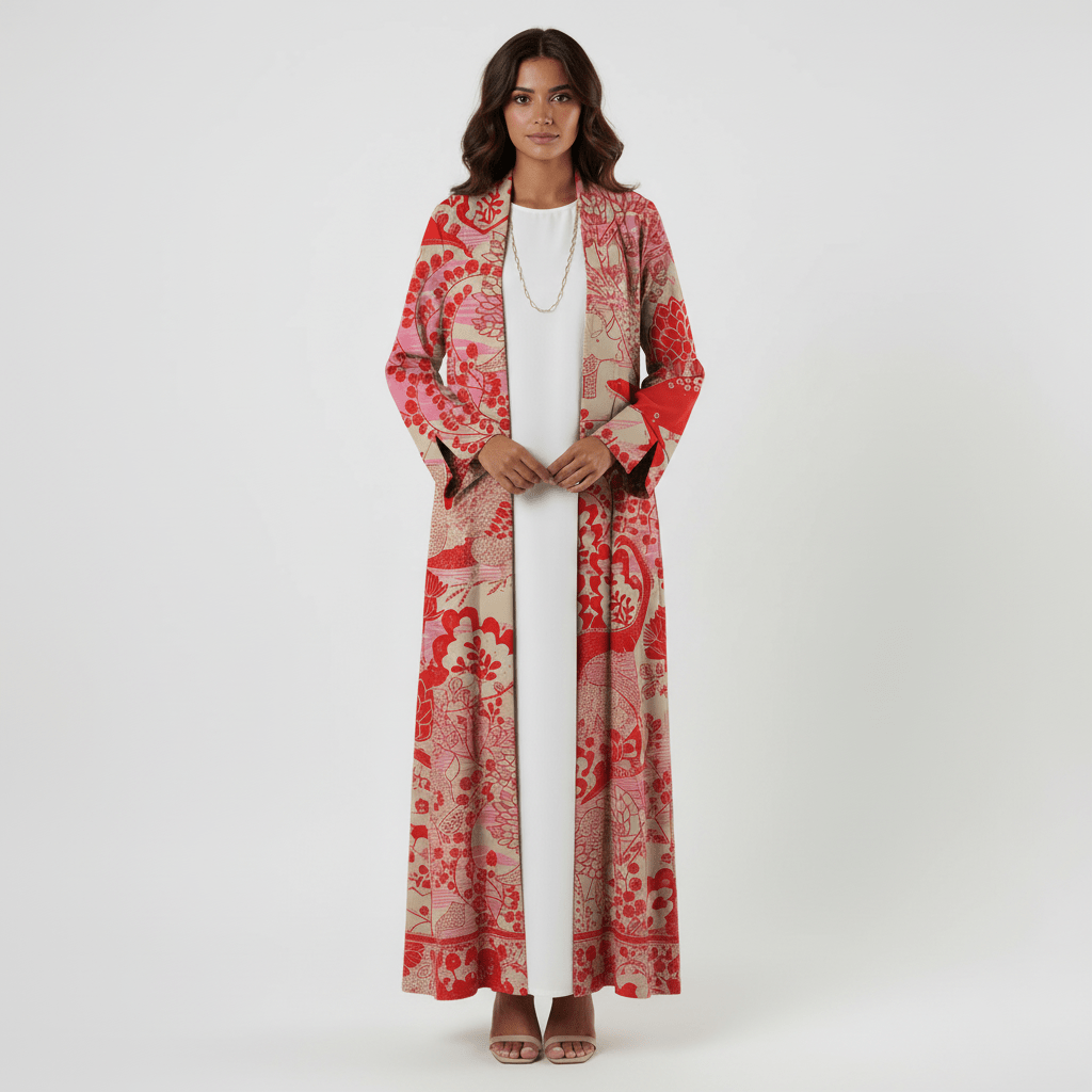 This soft linen abaya combines relaxed sophistication with vibrant design. The red and beige floral print adds a touch of artistic flair, while the breathable linen ensures comfort in every season. With its open-front silhouette and fluid movement, it’s perfect for both elevated daytime styling and elegant evening outings.