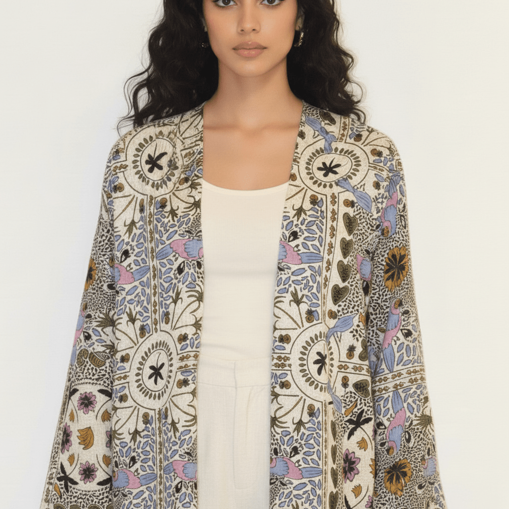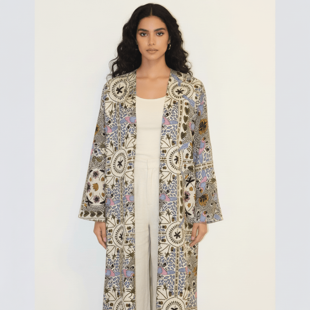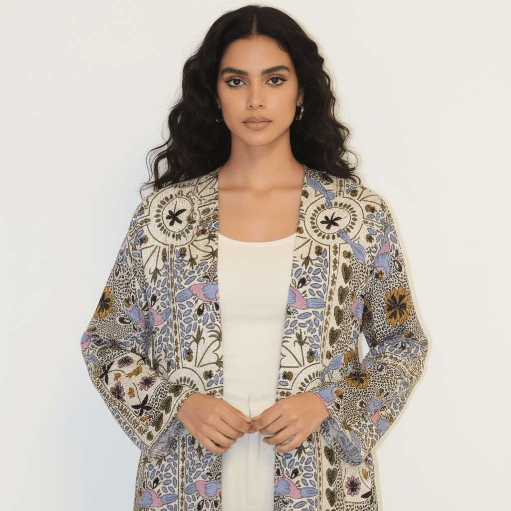Crafted from breathable soft linen, this abaya showcases a mosaic-inspired embroidered design that combines rich texture with modern modesty. The open-front cut and airy fabric make it both comfortable and versatile—ideal for elevating everyday looks or adding elegance to special occasions.