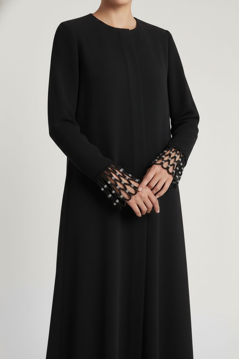 This closed abaya balances classic elegance with contemporary detail. Crafted in a smooth, flowing fabric, the design is intentionally minimal through the body, allowing the finely executed cutwork cuffs to take focus. The geometric lattice detail adds texture and visual interest while remaining modest and refined. With its clean neckline and effortless drape, this abaya is ideal for both elevated occasions and polished everyday wear.
