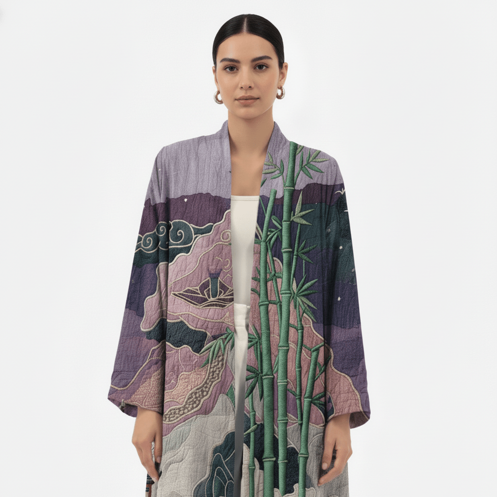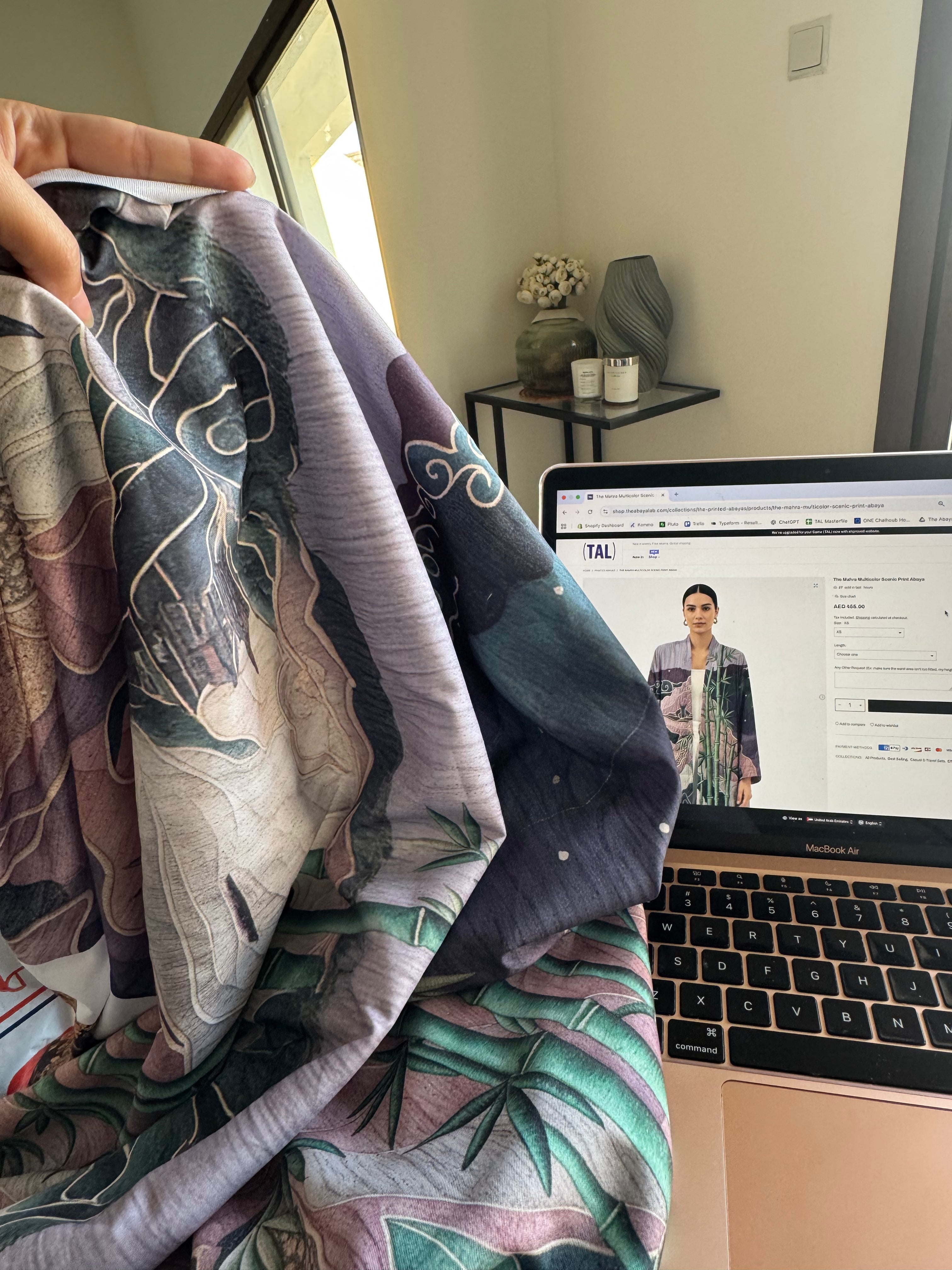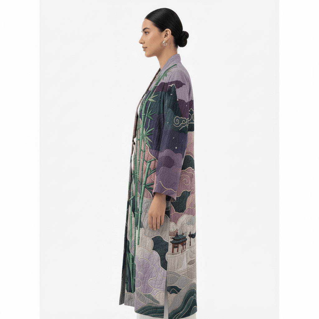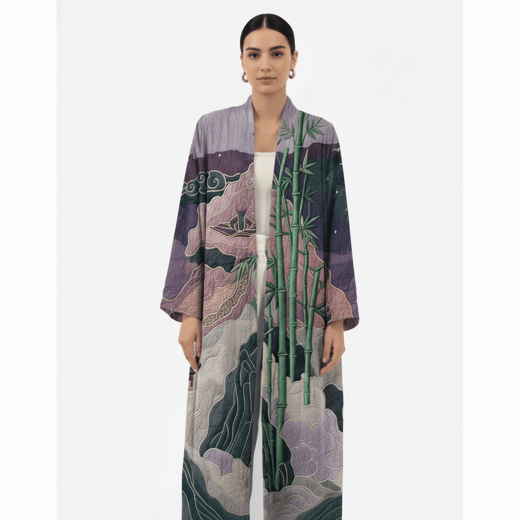 Crafted from premium cotton satin, this abaya showcases a painterly landscape in rich shades of lilac, green, and deep blue. The fabric’s gentle sheen enhances the intricate print, while its breathable structure ensures comfort throughout the day. Designed with a relaxed, open-front silhouette, it drapes fluidly for an artful yet refined finish—ideal for special occasions or standout everyday wear.