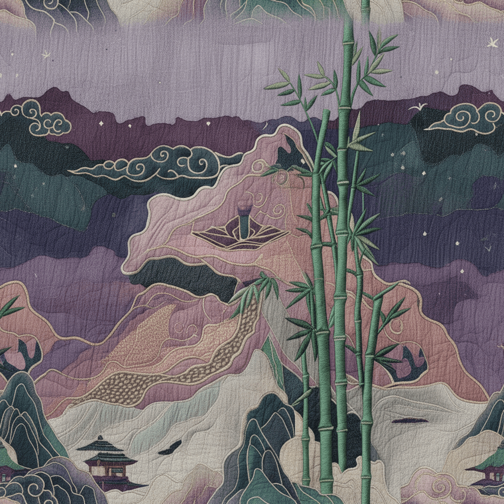Scenic print featuring mountains, clouds, and bamboo motifs