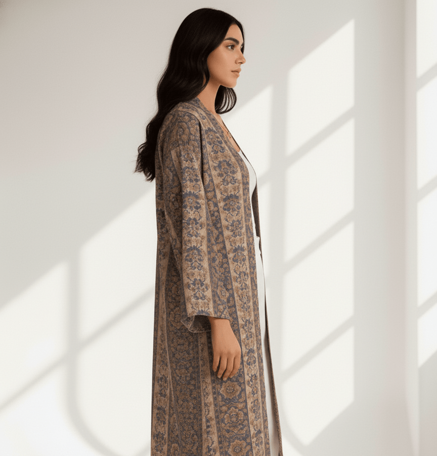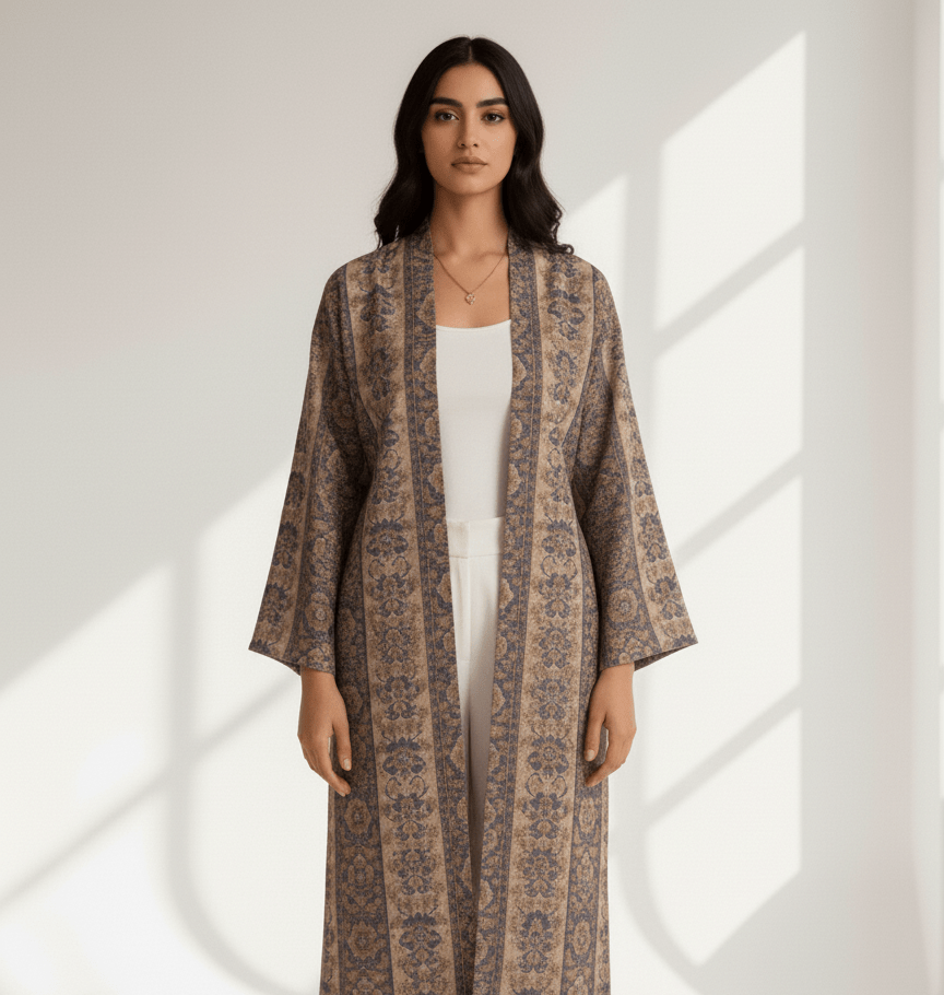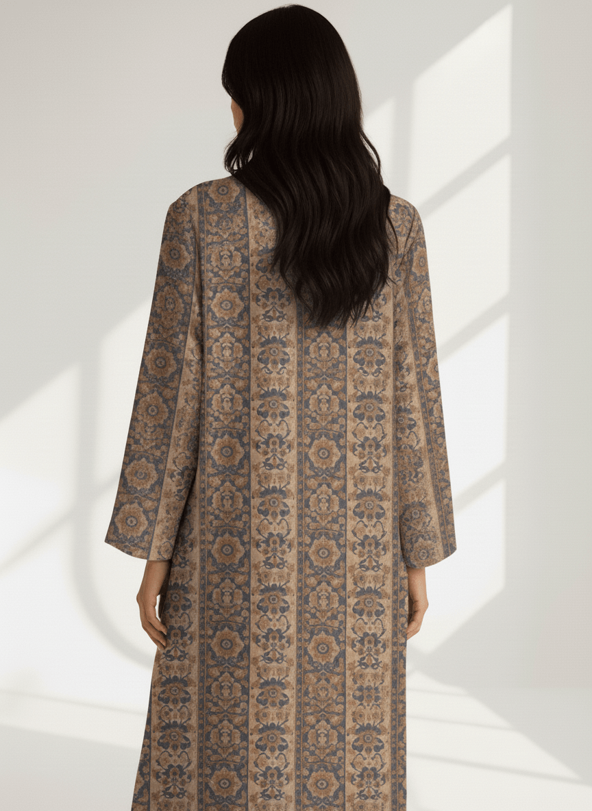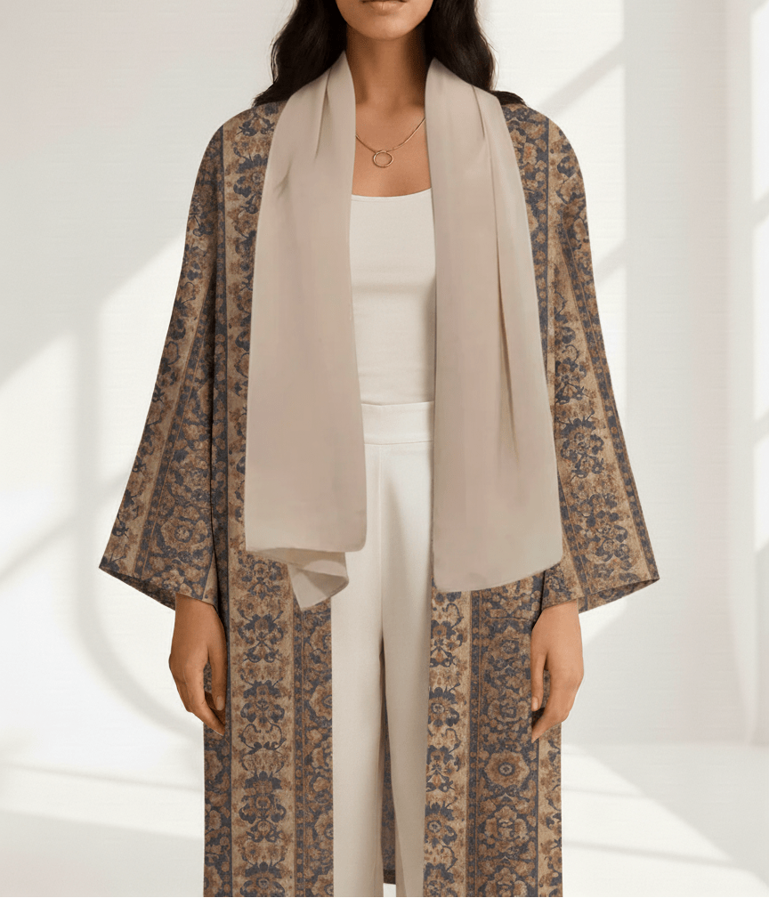 Crafted from a linen mix, this open-front abaya offers a naturally breathable feel with a softly structured drape. The intricate tile-inspired print adds depth and character, while the relaxed silhouette makes it easy to style over simple bases or co-ord sets. A refined yet practical piece designed for effortless, all-day wear.