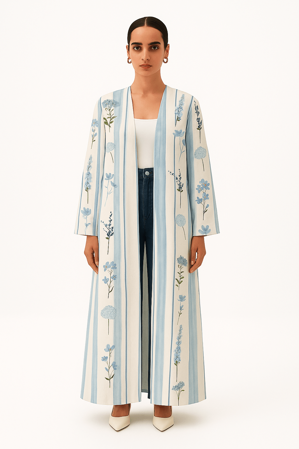 Description: A flowing abaya that combines soft stripes with delicate florals. Highlights: Lined chiffon for modest opacity and lightweight comfort Vertical stripes create a lengthening effect Scattered floral motifs for a fresh, feminine touch Open-front cut for versatile layering Floor length for full coverage elegance Description: Crafted in lined…