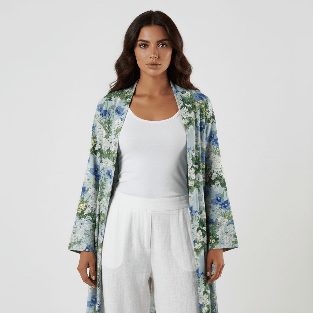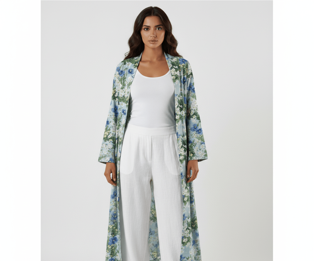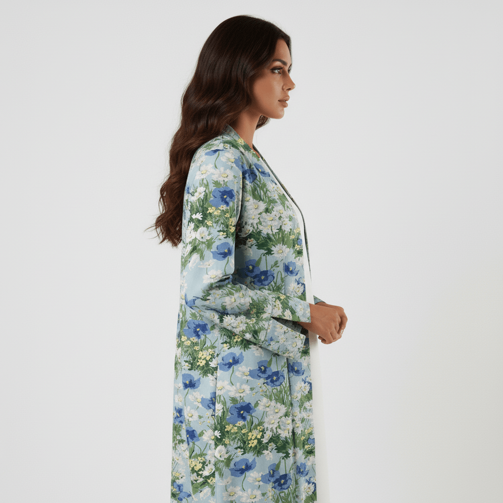 Crafted in a breezy linen blend, this blue floral abaya brings a touch of nature-inspired elegance to your wardrobe. The open-front silhouette drapes gracefully over any outfit, while the delicate print adds a fresh, feminine charm. Perfect for daytime occasions or casual gatherings, it offers easy sophistication with lasting comfort.