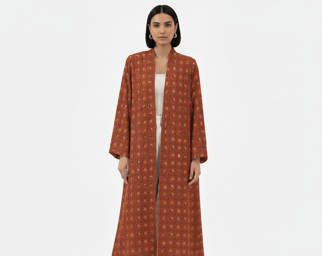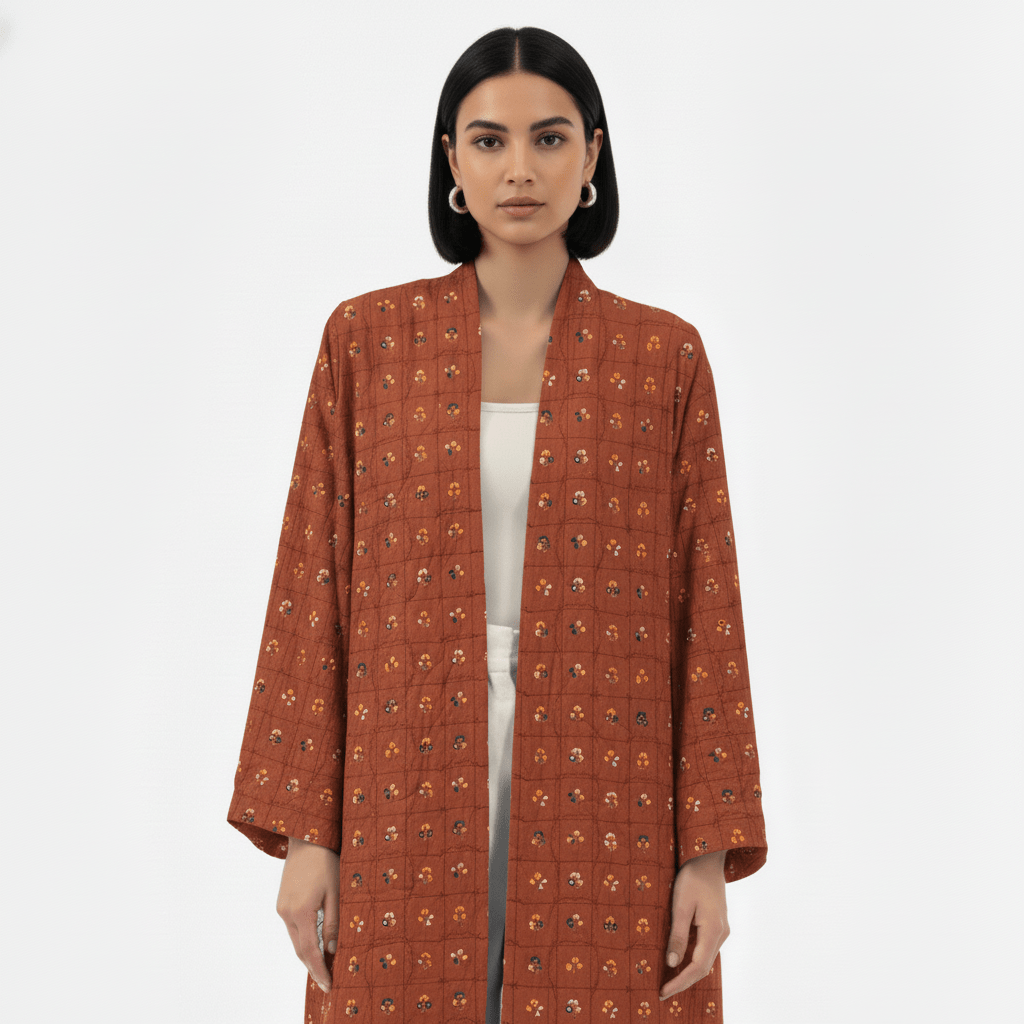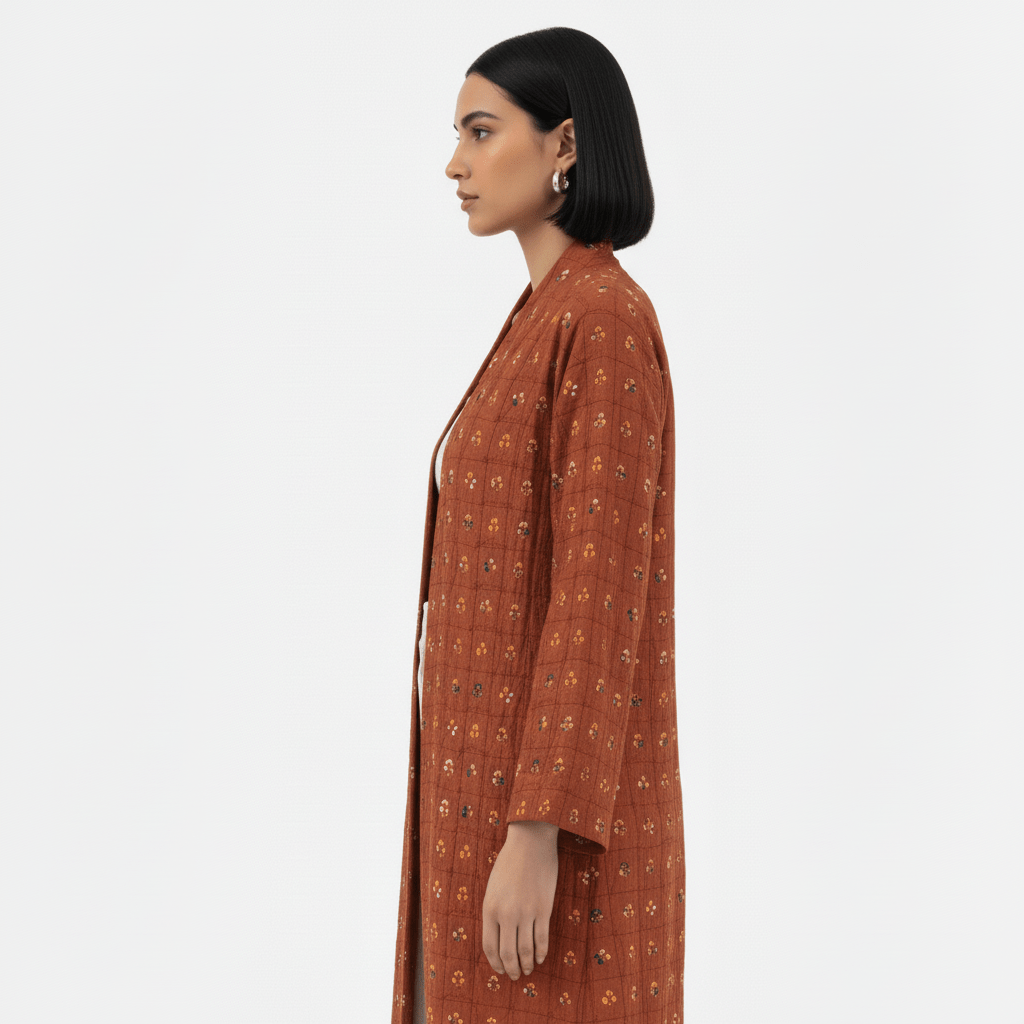 Crafted from a breathable linen mix, this rust abaya is adorned with subtle geometric embroidery for a refined artisanal touch. Its open-front silhouette drapes easily over any outfit, making it perfect for both casual wear and elevated outings. The natural texture of the fabric adds dimension while ensuring all-day comfort.