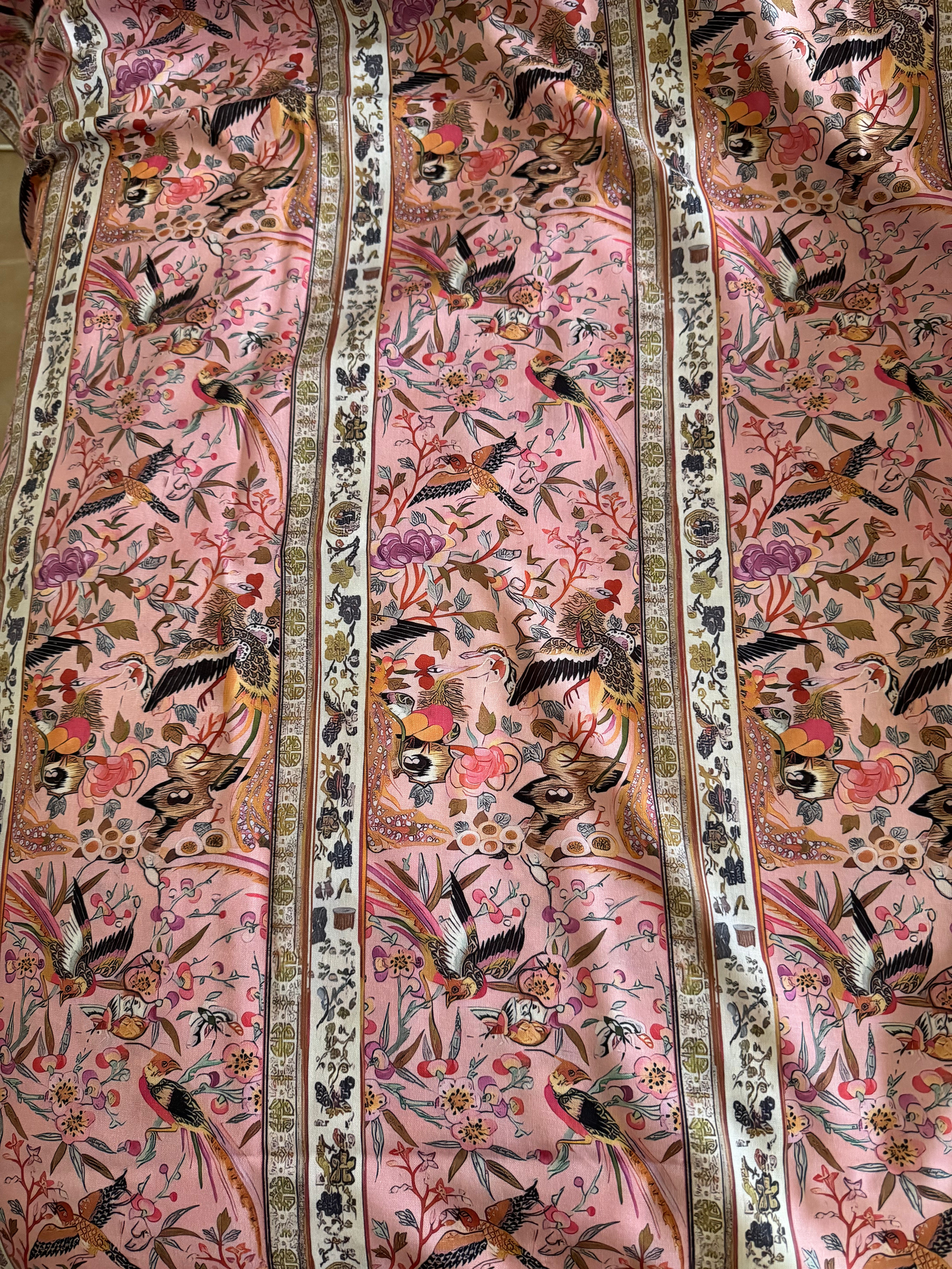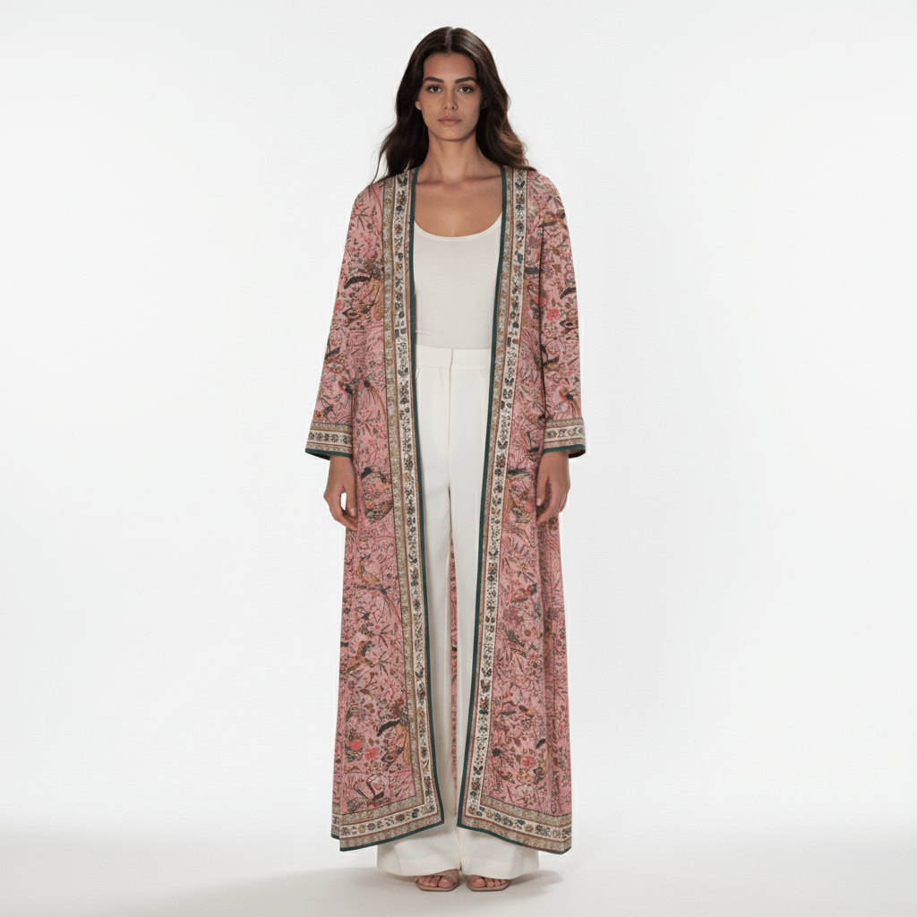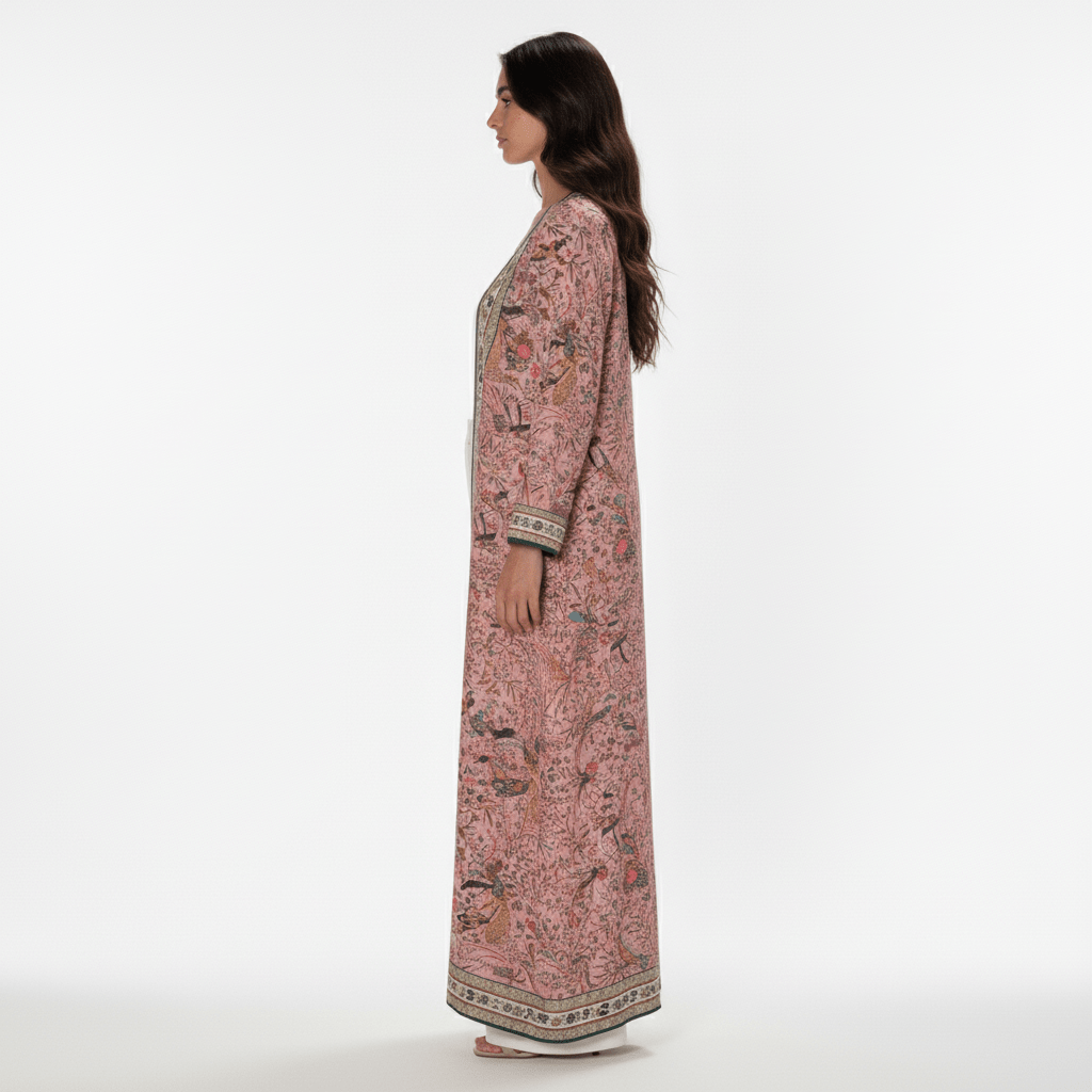 Crafted from airy muslin, this blush-toned kimono brings together comfort and artistry. The delicate floral and bird motifs are framed by an ornate border, adding sophistication to its relaxed shape. Perfect for layering over simple basics, it lends a touch of color and pattern to everyday outfits.