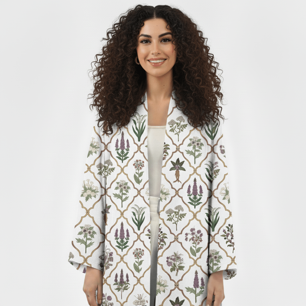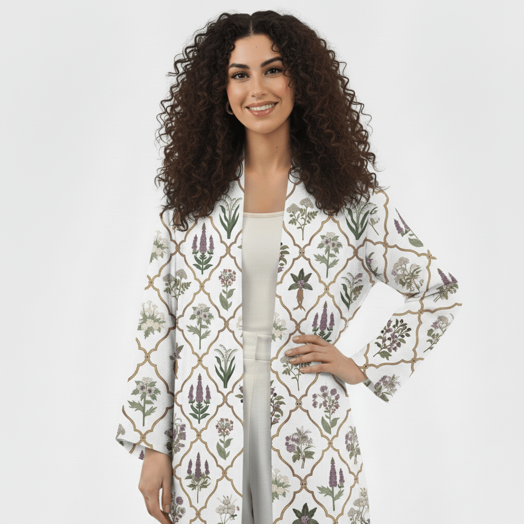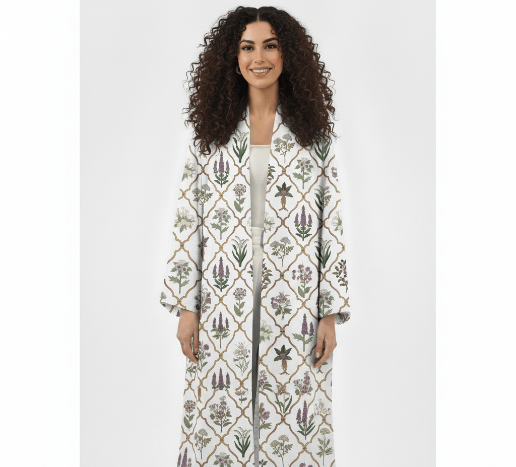 Crafted from airy soft linen, this white abaya features a delicate botanical motif framed within geometric patterns for a modern twist. The open-front silhouette drapes gracefully, offering comfort and versatility through the seasons. Ideal for daytime sophistication or relaxed evening styling.