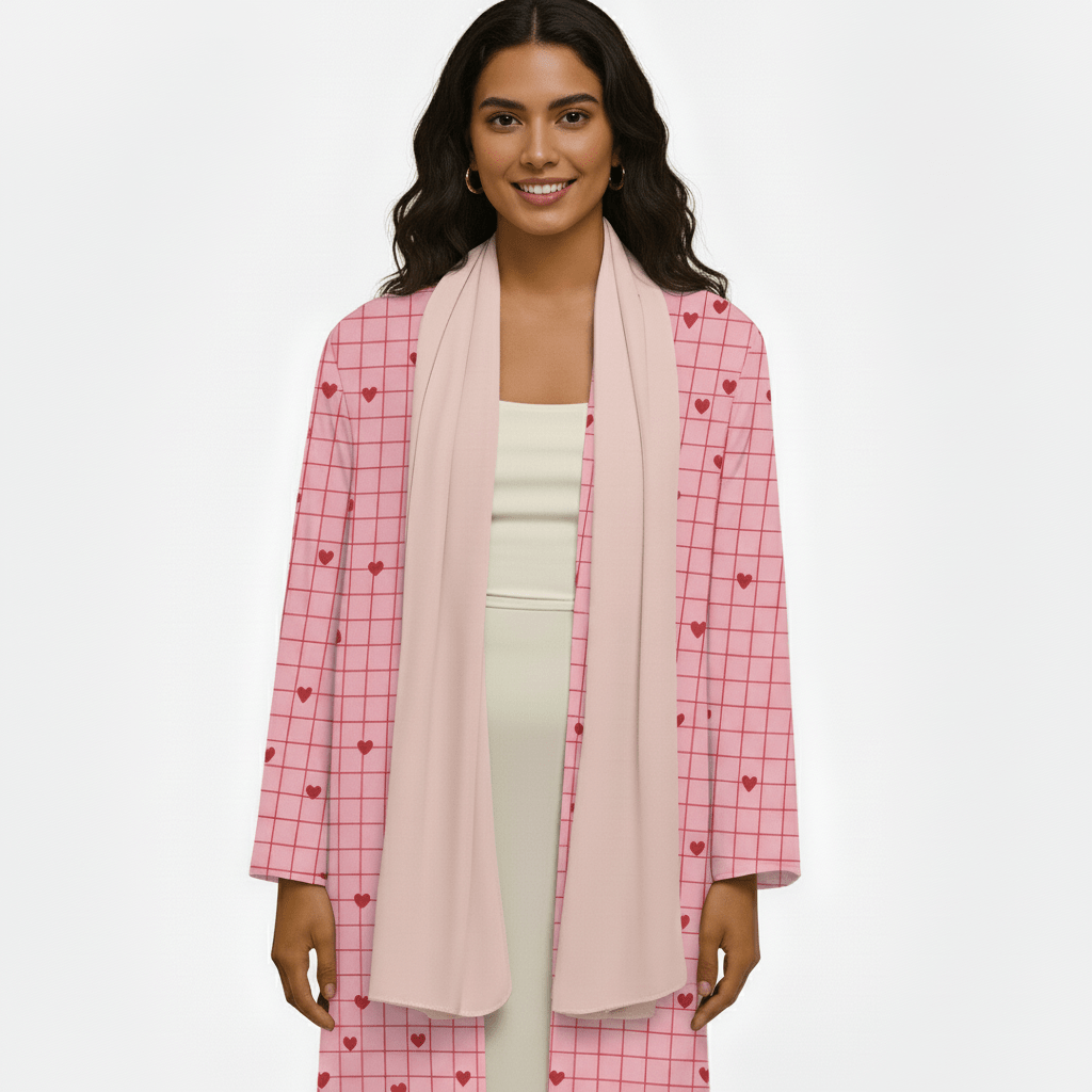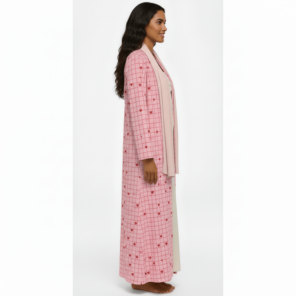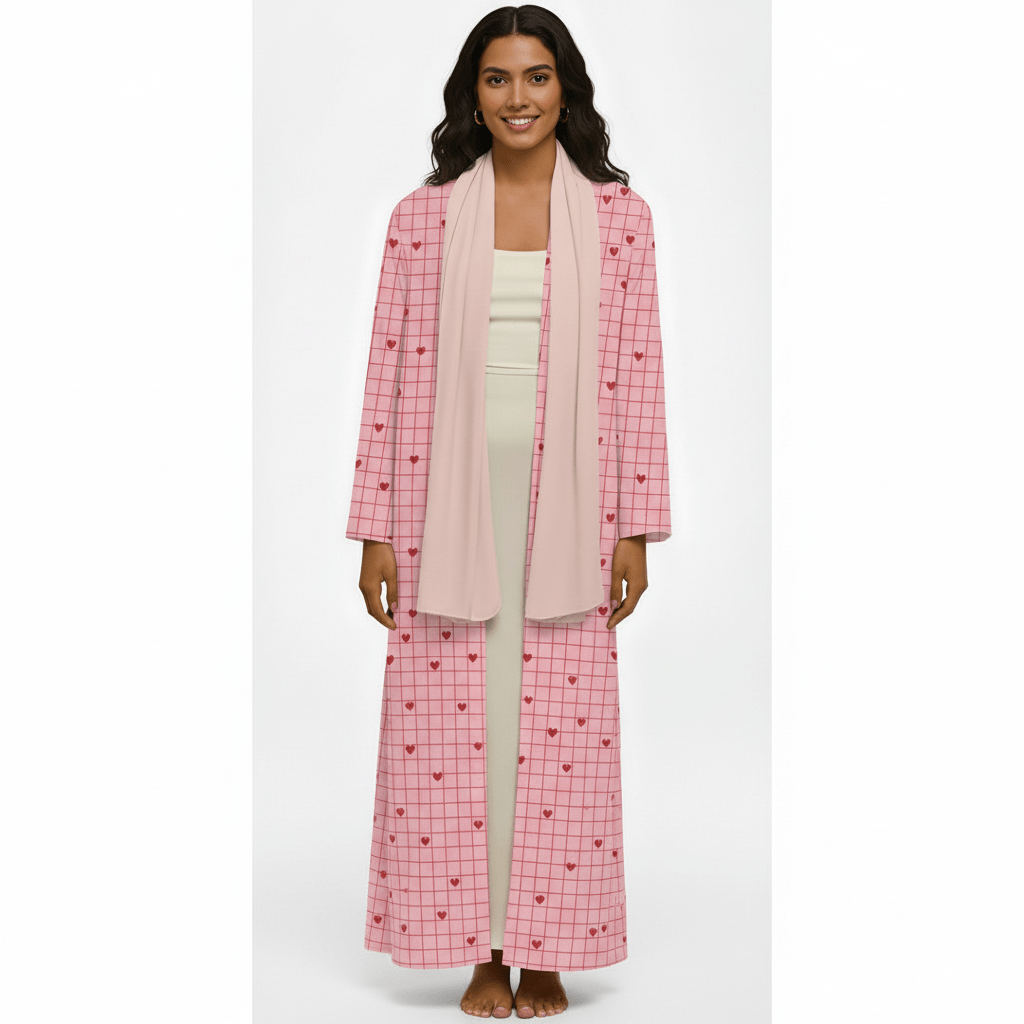 Crafted from a soft cotton-satin mix, this abaya blends everyday comfort with a subtly refined finish. The cheerful heart-print design is balanced by a fluid drape and minimalist cut, making it an effortlessly modern choice. Pair it with neutral tones or blush accessories for a coordinated, feminine look.
