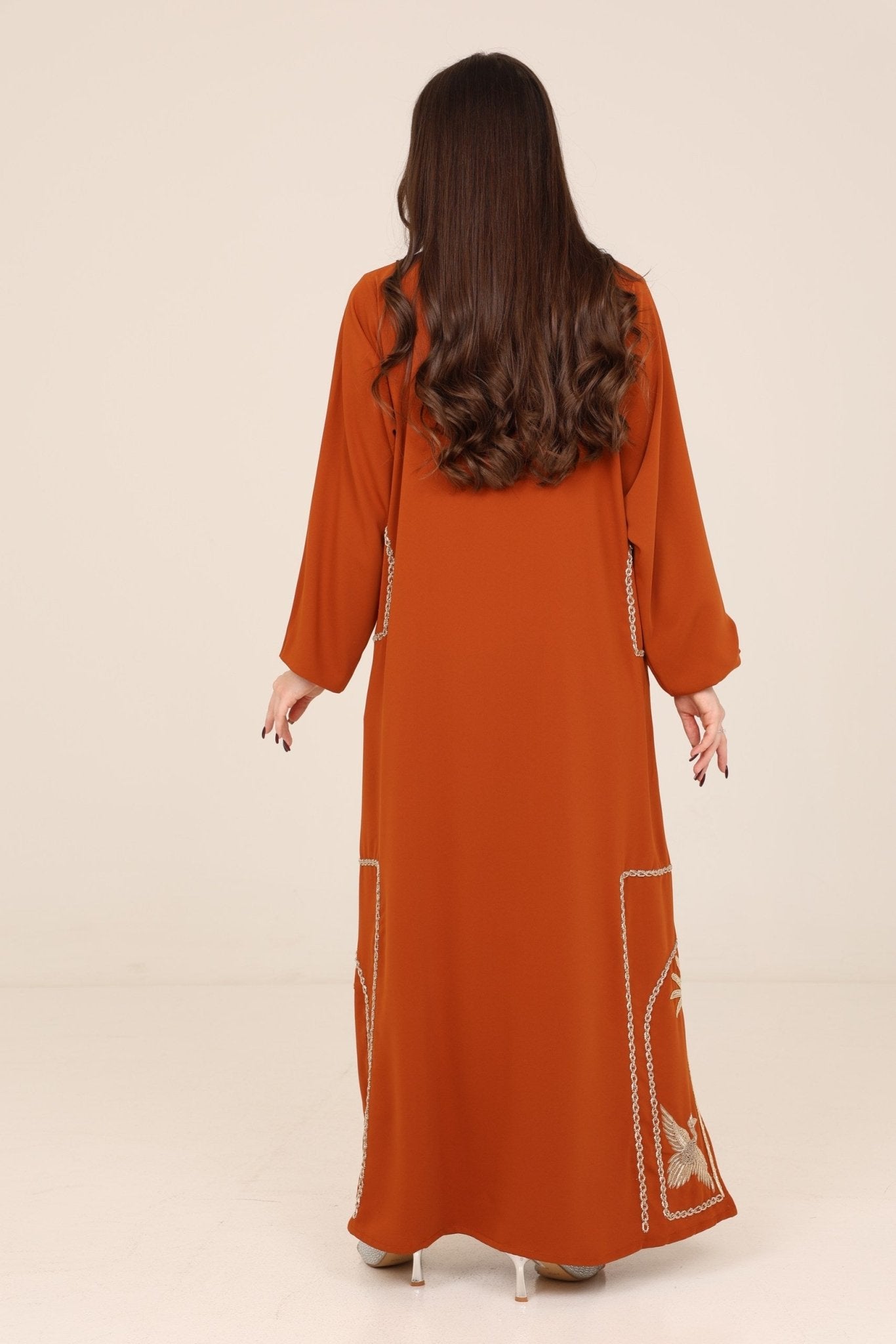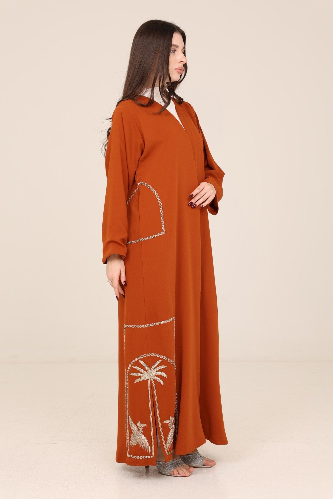 The Noura Rust Embroidered Palm & Bird Abaya