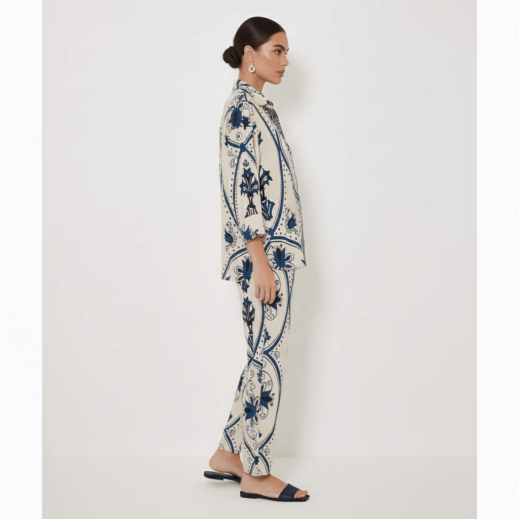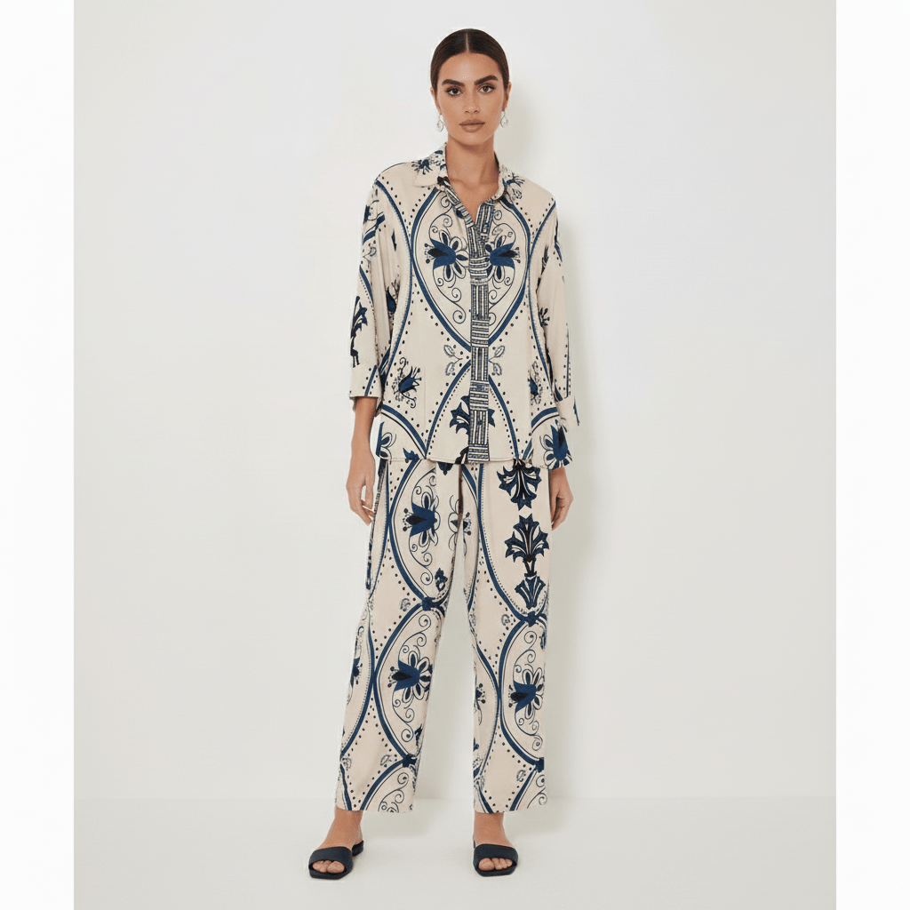 What’s Included: Two-piece set – printed shirt and matching wide-leg trousers.