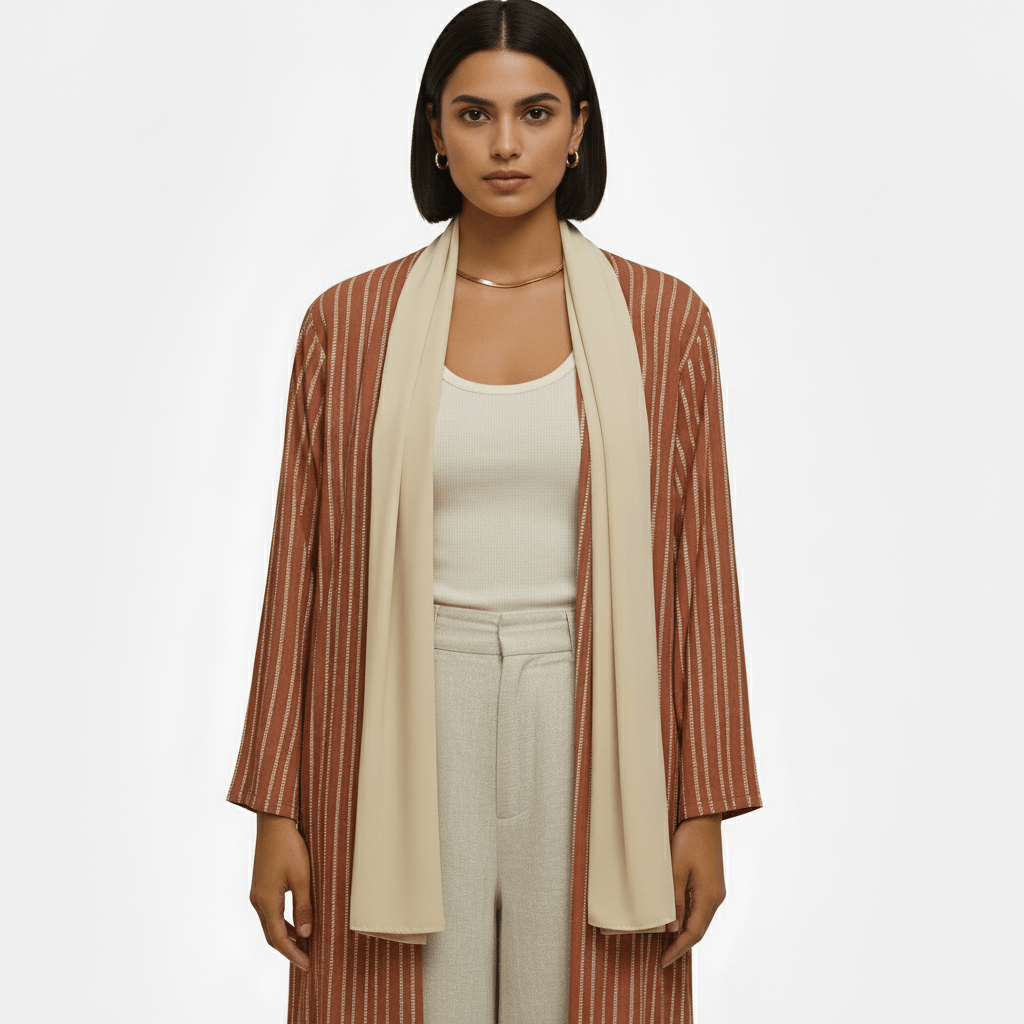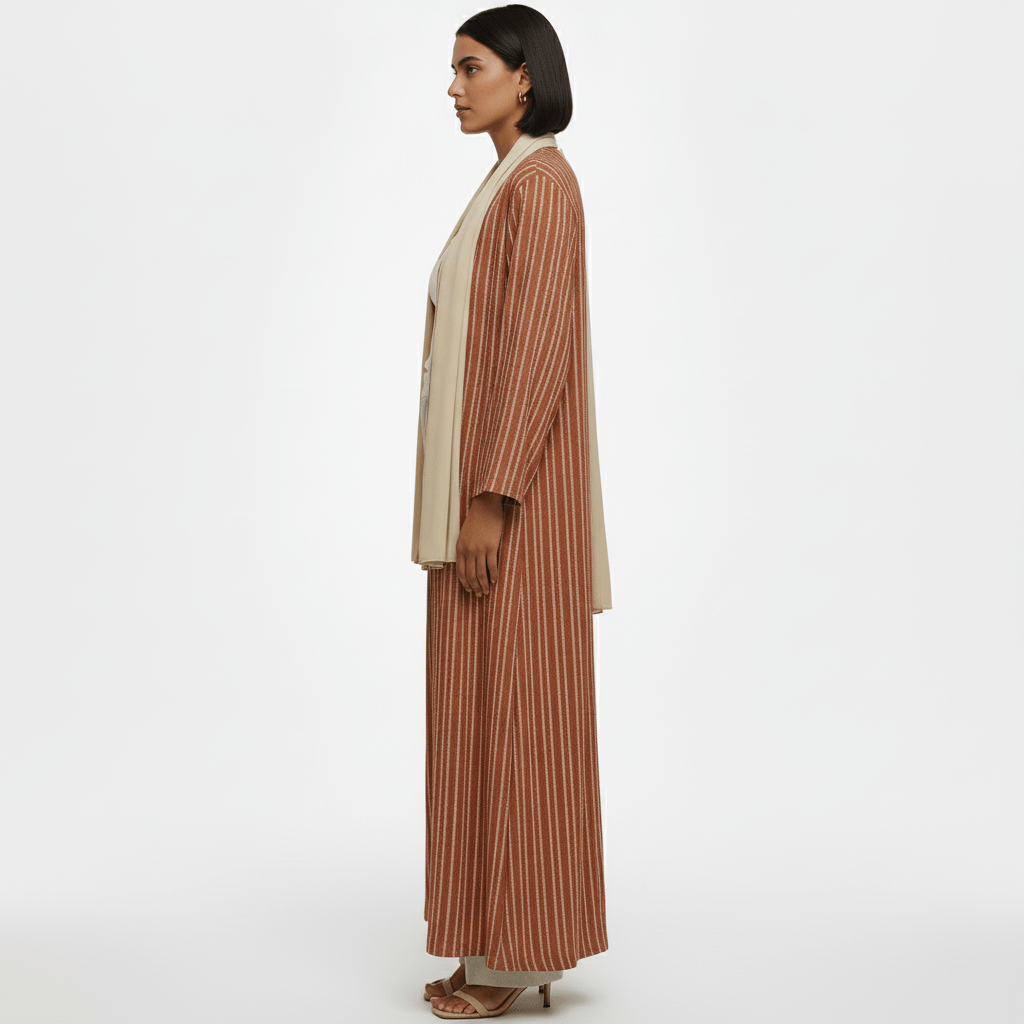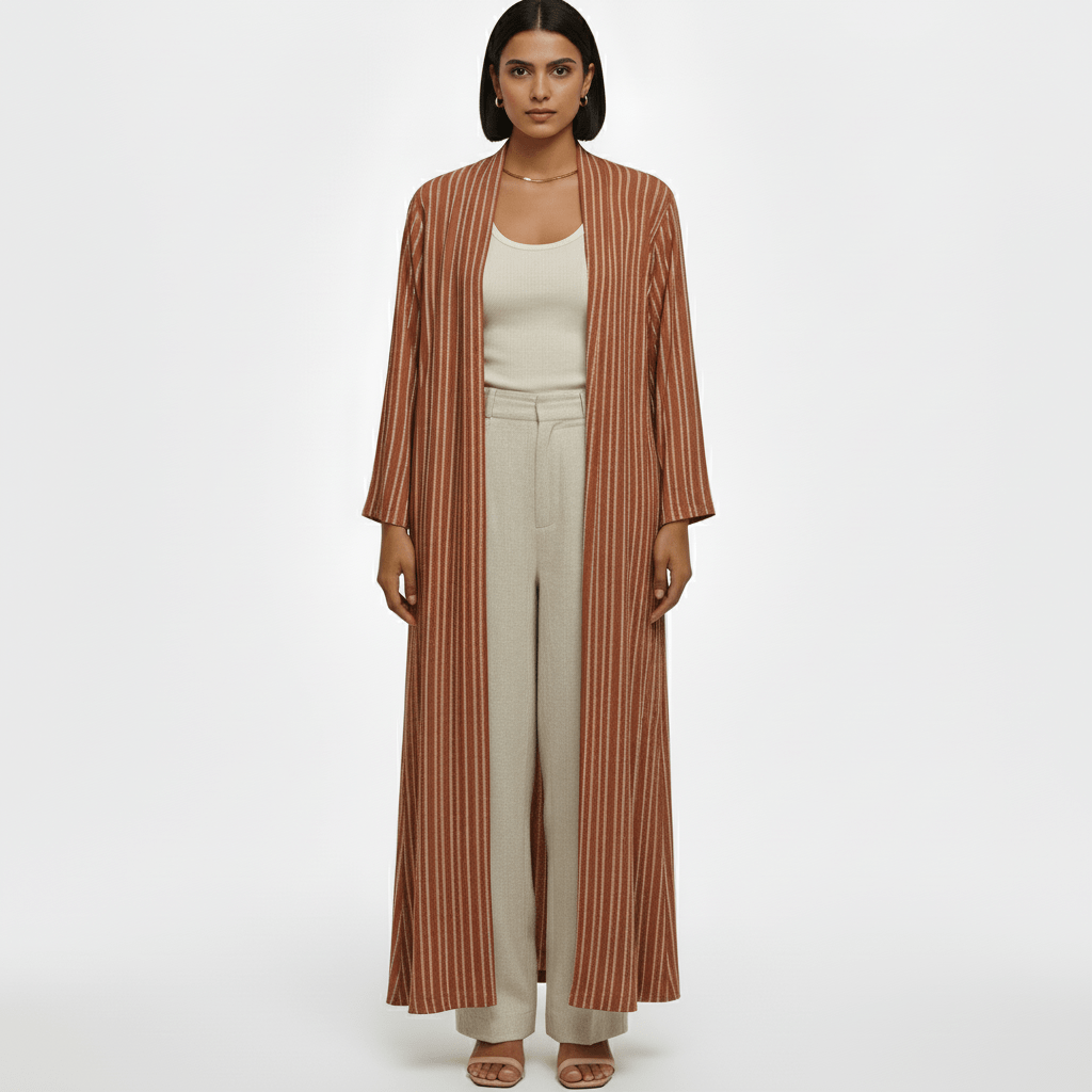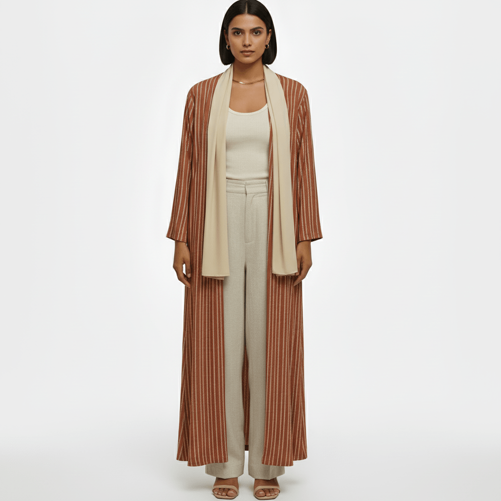 Crafted from a breathable linen mix, this rust-toned abaya brings understated elegance to everyday dressing. The vertical stripe pattern adds subtle structure, while the open-front design allows for effortless layering over both casual and formal looks. Its natural texture and fluid fall make it a timeless piece for warm-weather wear and beyond.