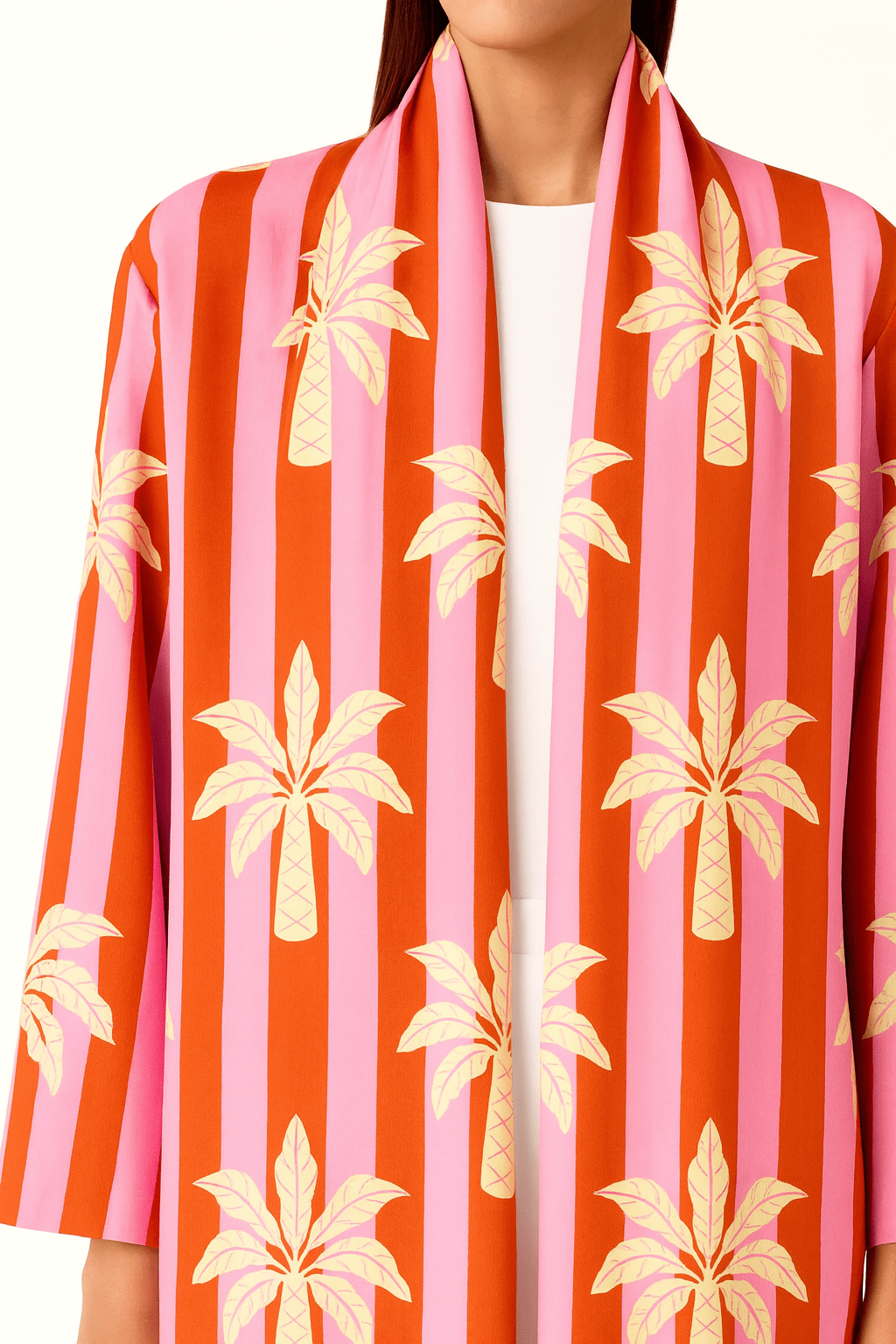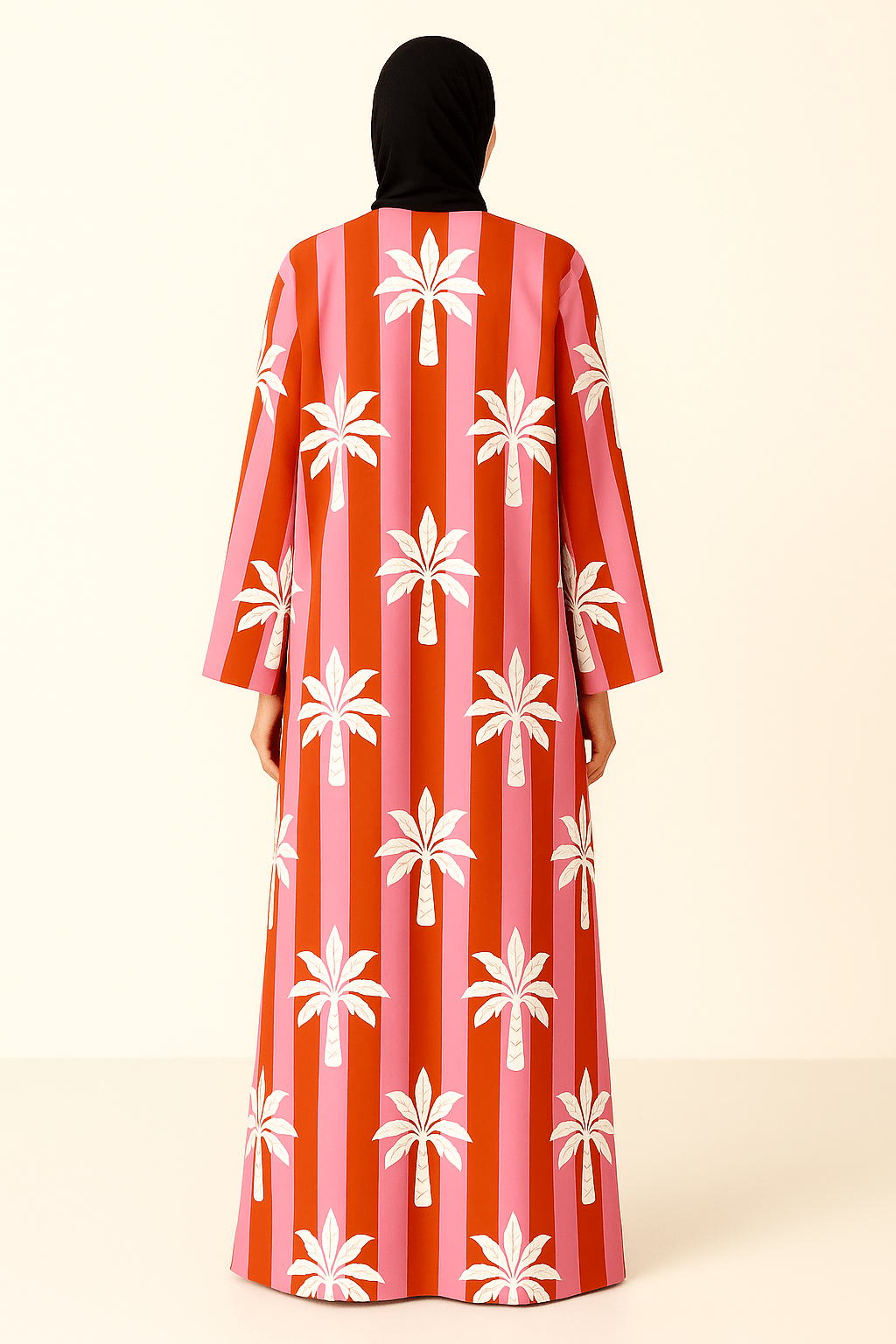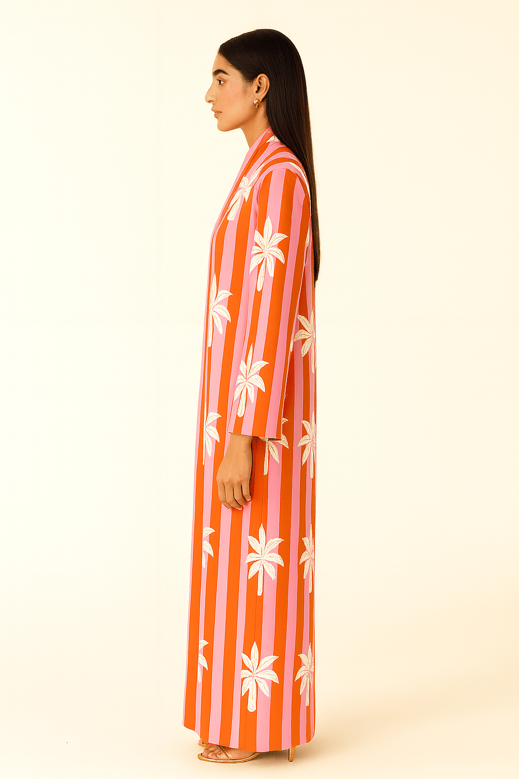 This abaya makes a confident statement with its pink-and-red striped base and oversized palm motif. Cut from mang silk, it flows with a natural drape while remaining lightweight and breathable—ideal for transitional seasons and summer evenings. Designed with a relaxed open front, it layers seamlessly over both casual and elevated looks.