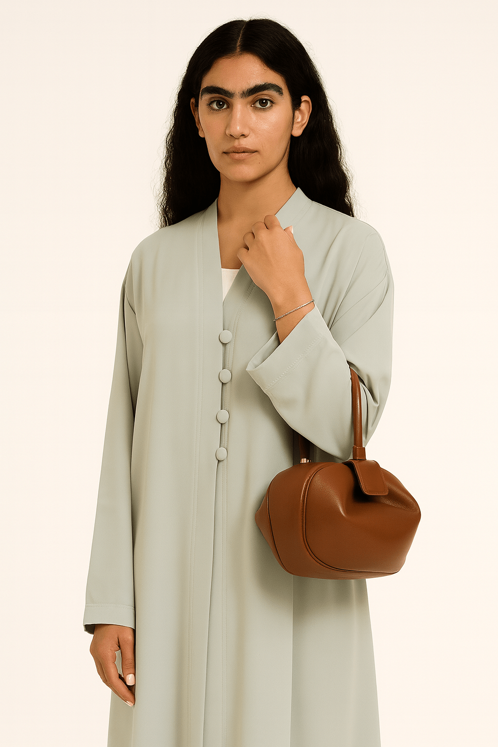Description: Minimalist and refined, the Green-Grey Cool Crepe Abaya is a modern staple for your modest wardrobe. Designed in a muted green-grey tone, it features a sleek front with fabric-covered buttons for a touch of understated elegance.