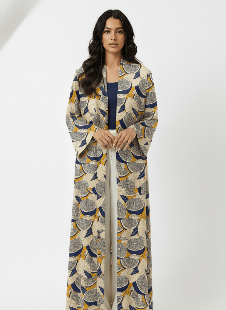Crafted from breathable linen, this printed abaya is designed for relaxed elegance. The open-front cut drapes naturally over the body, making it an easy throw-on for casual days or elevated evenings. Finished with an artistic, Mediterranean-inspired print, it layers seamlessly over dresses, or tops.