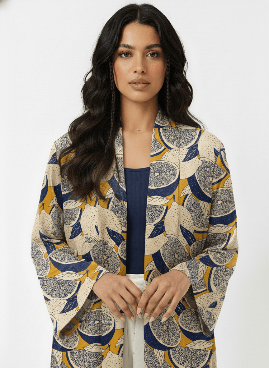 Color: Navy, mustard, and cream with a bold abstract citrus-inspired print