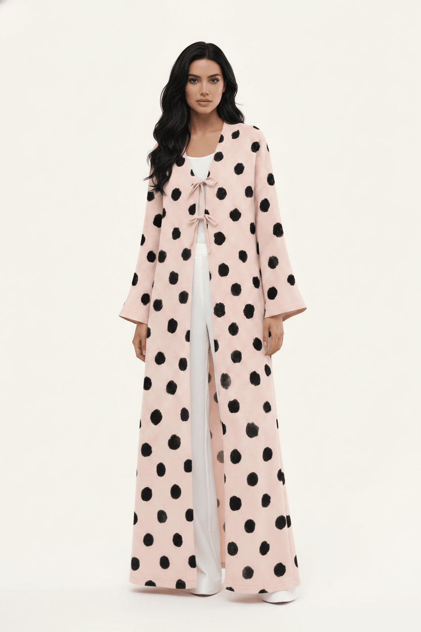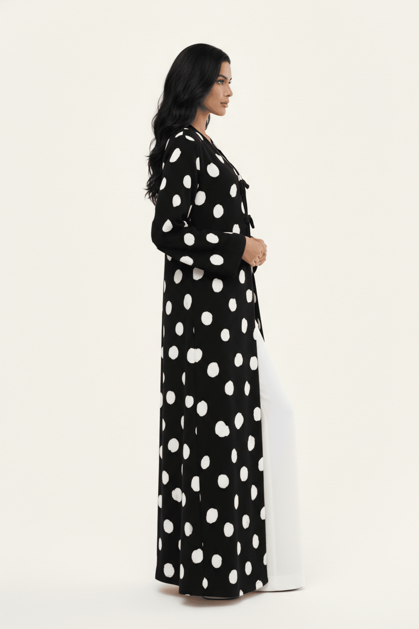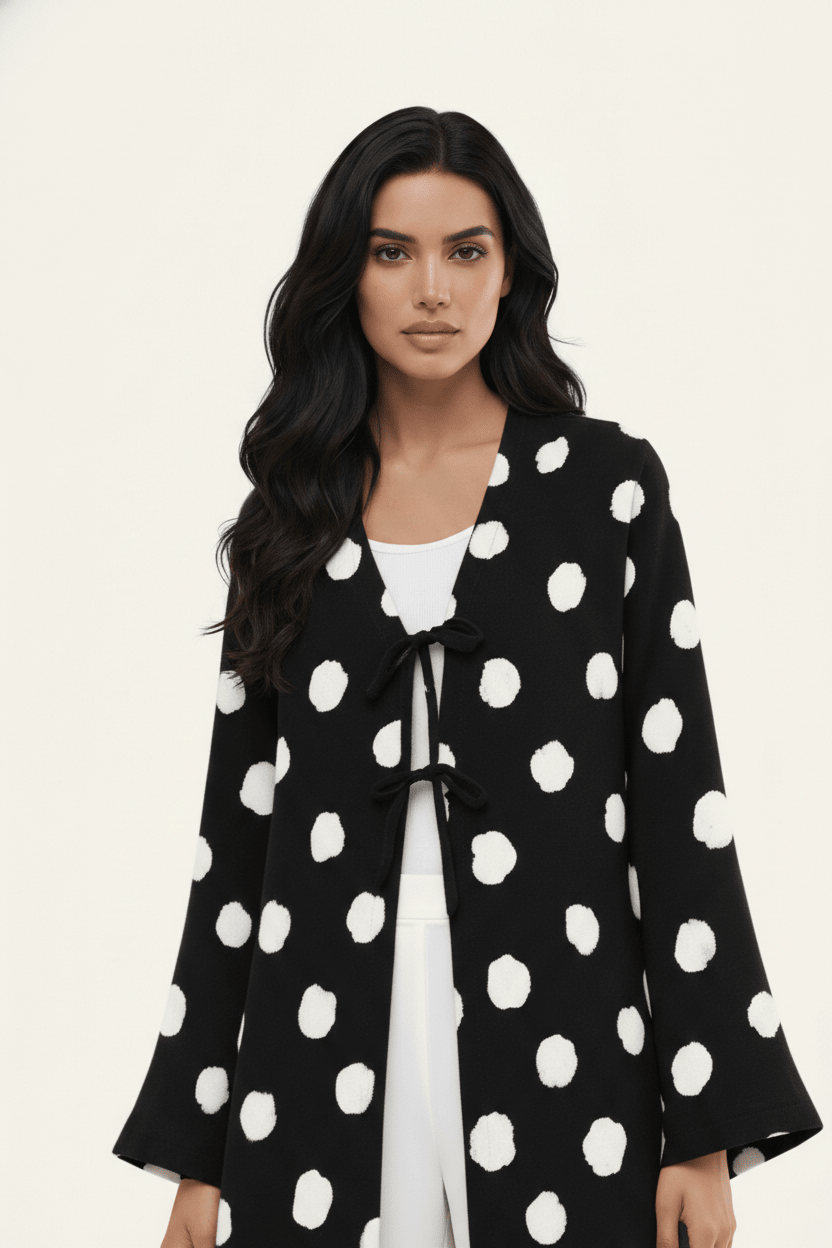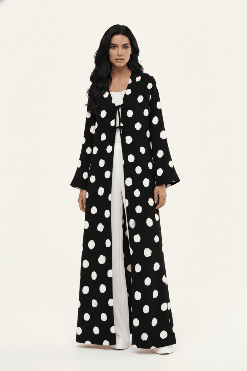 A statement polka-dot abaya elevated with double tie-front detailing, designed for playful elegance and effortless sophistication.