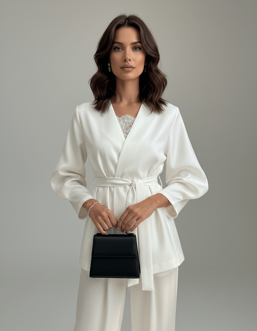 Crafted from a smooth satin mix, this ivory co-ord strikes the balance between polished and understated. The wrap top is fully lined for structure and ease, featuring a self-tie belt that cinches the waist while maintaining a soft, feminine flow. Paired with coordinating straight-leg trousers, the set creates a seamless, elongated line ideal for both formal settings and refined daytime looks.