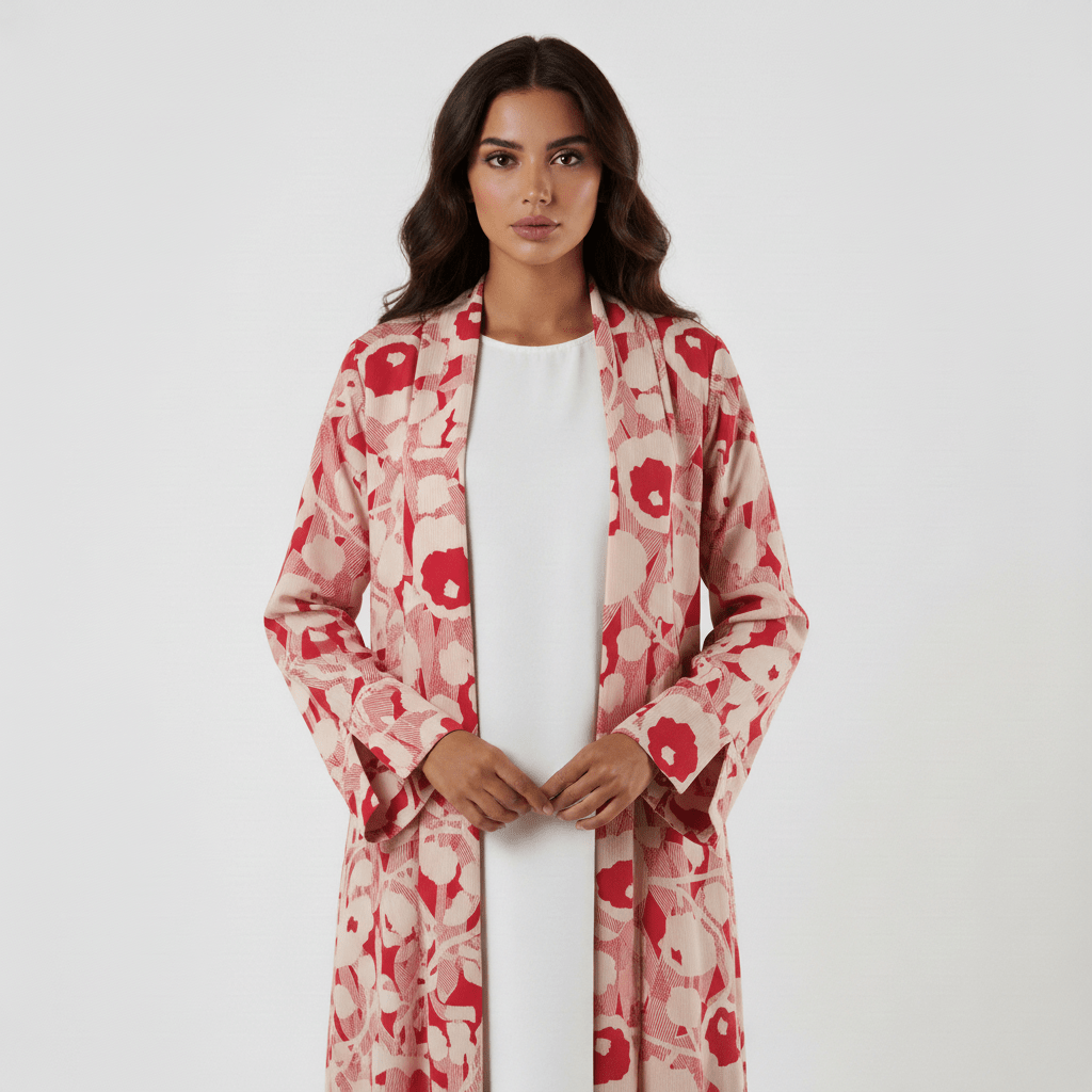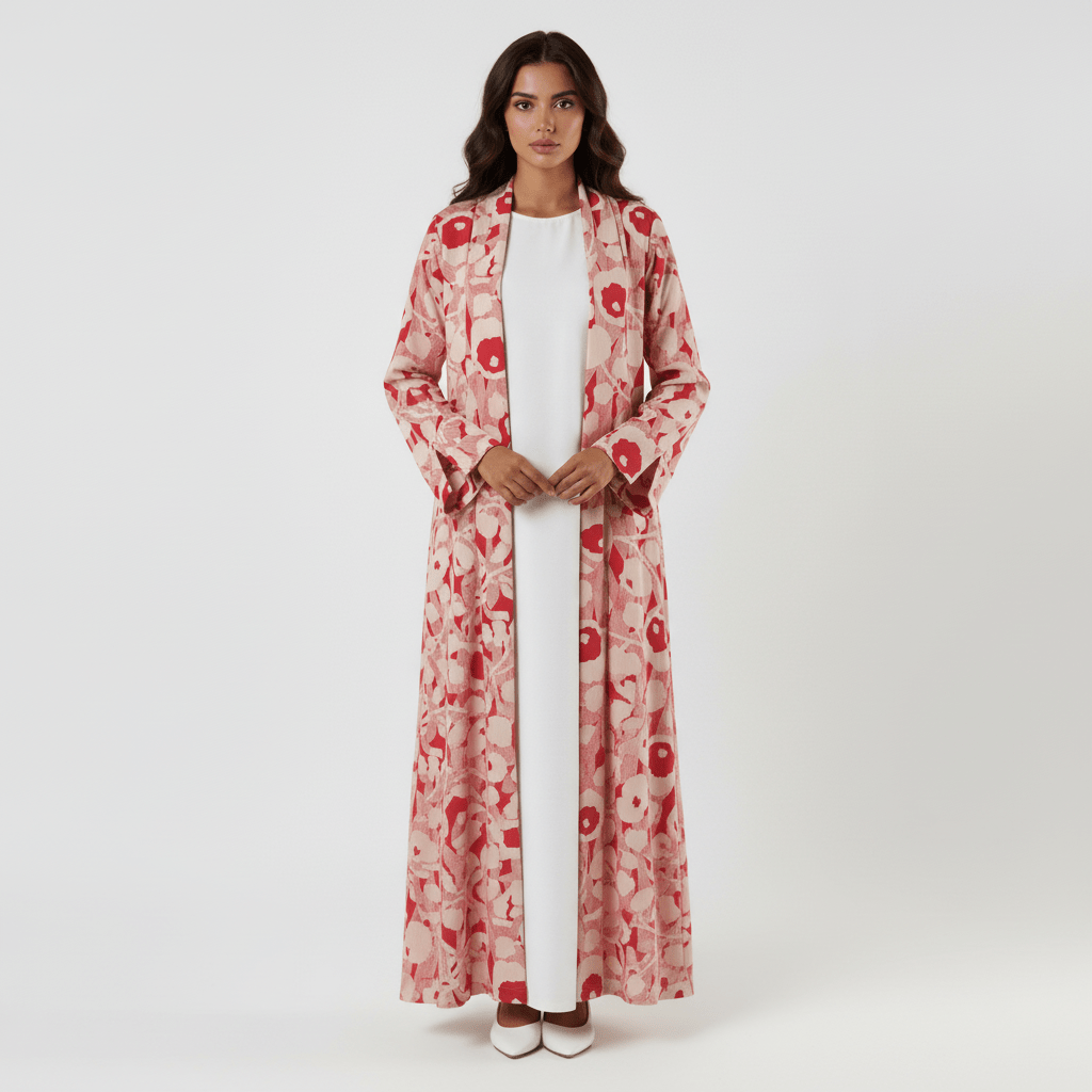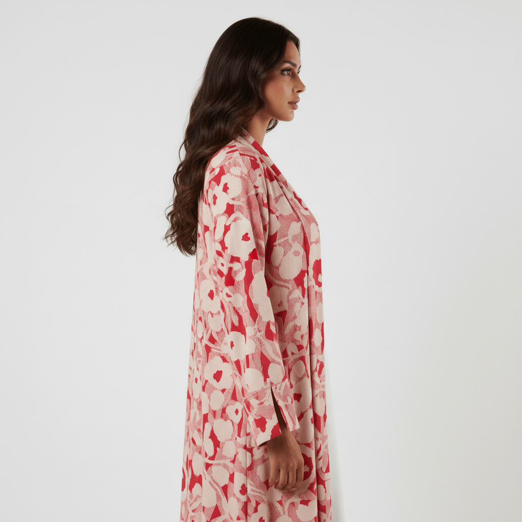 Crafted from a soft linen blend, this blush and red abaya reimagines floral print with contemporary flair. The open-front silhouette drapes naturally over any outfit, while the linen mix keeps it airy yet structured. Perfect for daytime elegance or weekend gatherings, it offers easy sophistication with every wear.