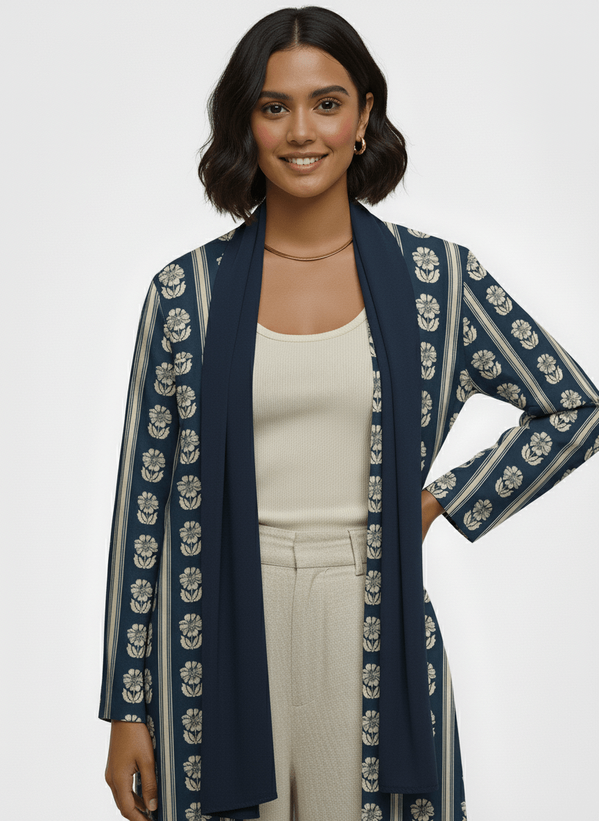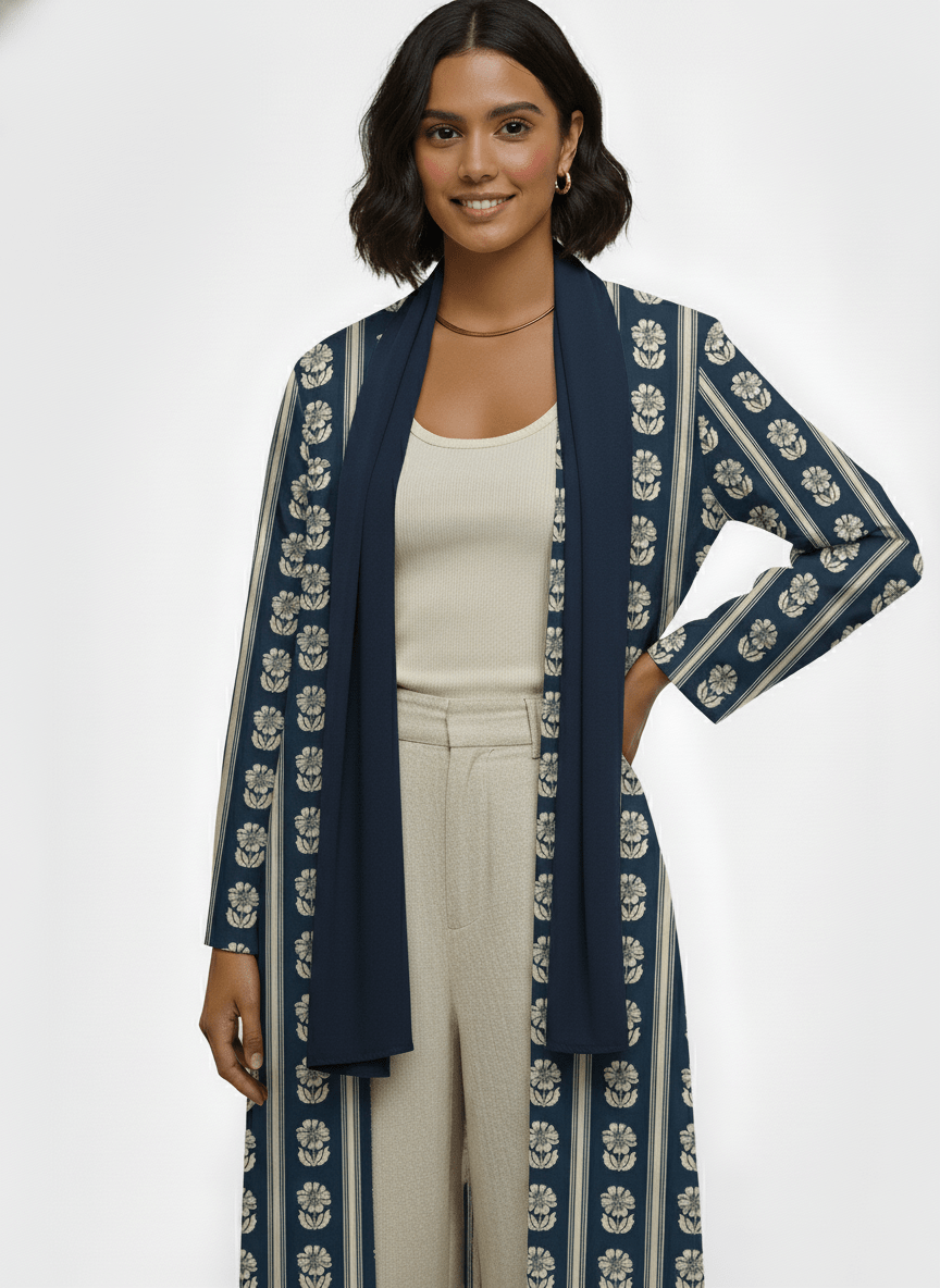 Crafted from a soft crepe mix, this navy open abaya flows beautifully while maintaining a clean, structured look. The vertical floral stripe pattern adds subtle detail and creates an elongated silhouette, making it easy to dress up or down. Designed as an everyday layering piece, it pairs effortlessly with neutral bases for a calm, sophisticated finish.