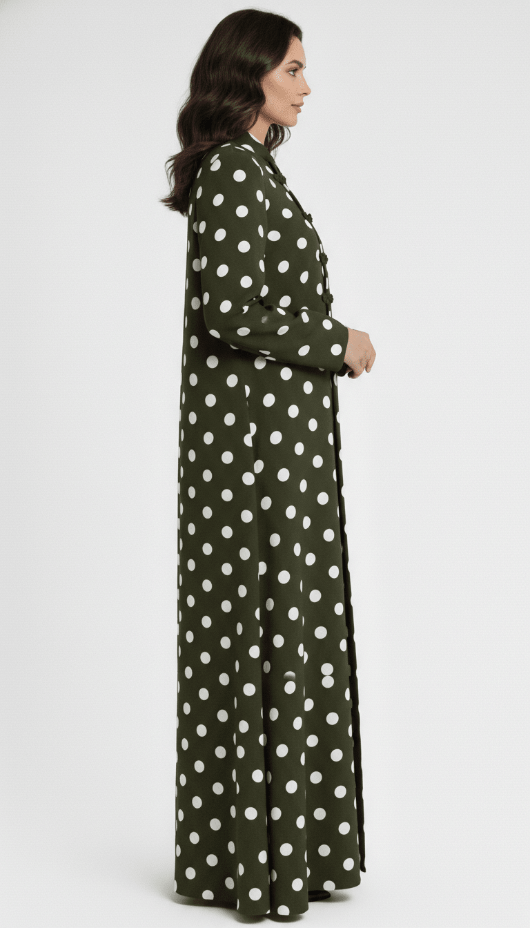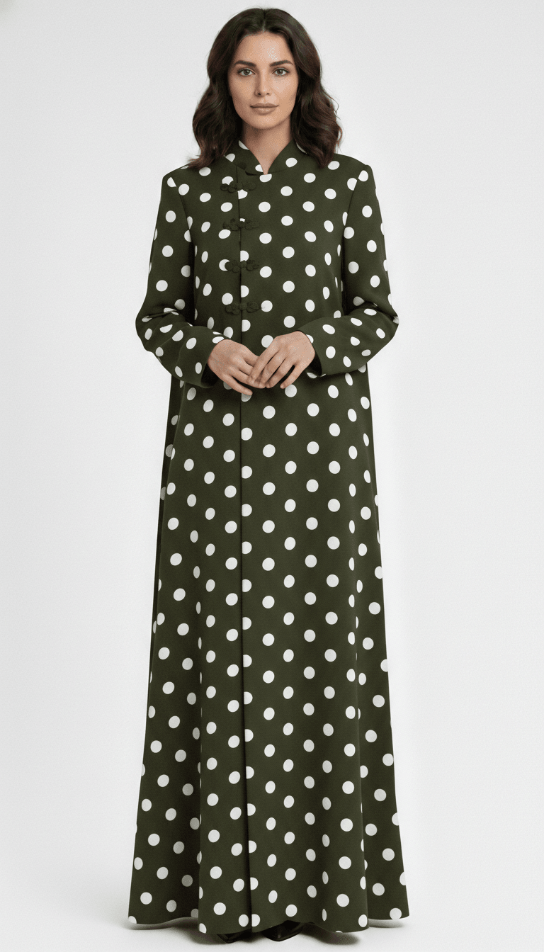 A refined polka-dot mandarin abaya designed with vintage charm and structured elegance.