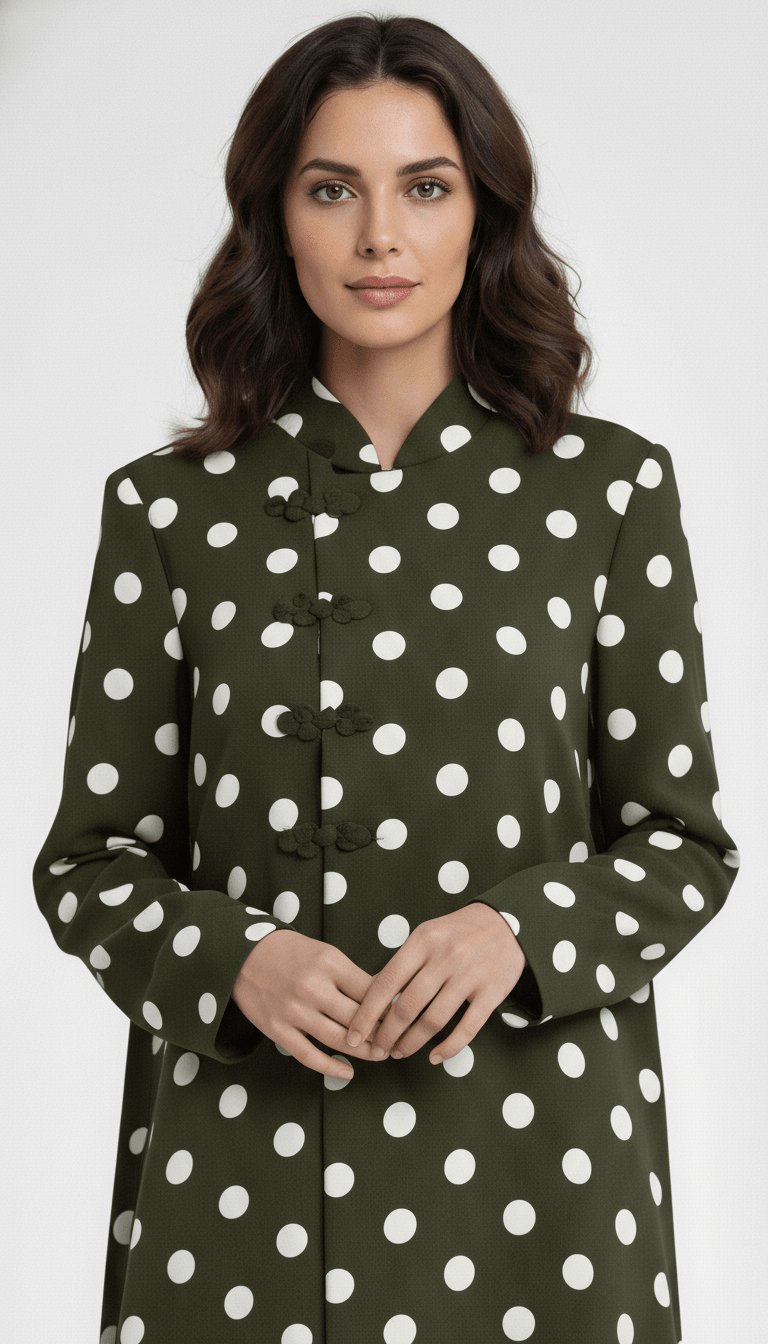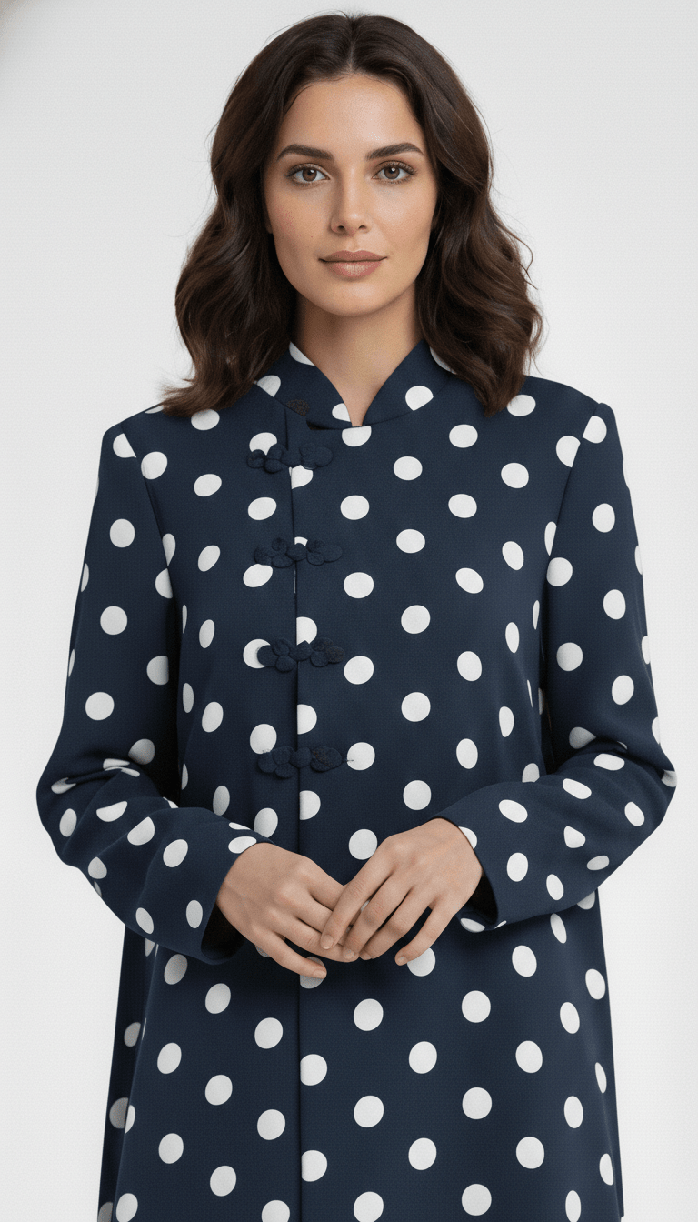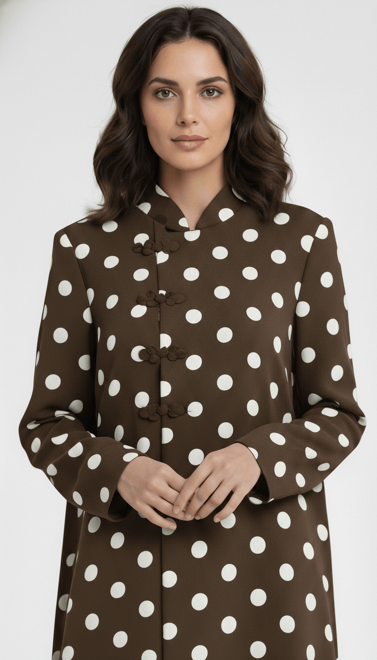 Delicate handcrafted mandarin buttons align vertically along the center front, adding subtle texture and heritage-inspired detailing that complements the playful polka-dot print. The concealed inner closure maintains a smooth, uninterrupted front for a sleek and graceful appearance.