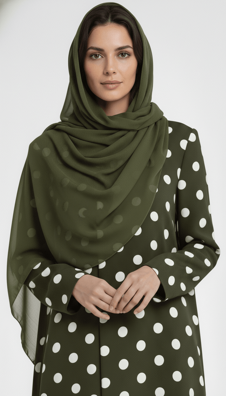 Blending classic femininity with contemporary structure, this mandarin-style polka-dot abaya offers effortless sophistication. The structured mandarin collar frames the neckline beautifully, creating a polished and refined finish that enhances the clean silhouette.
